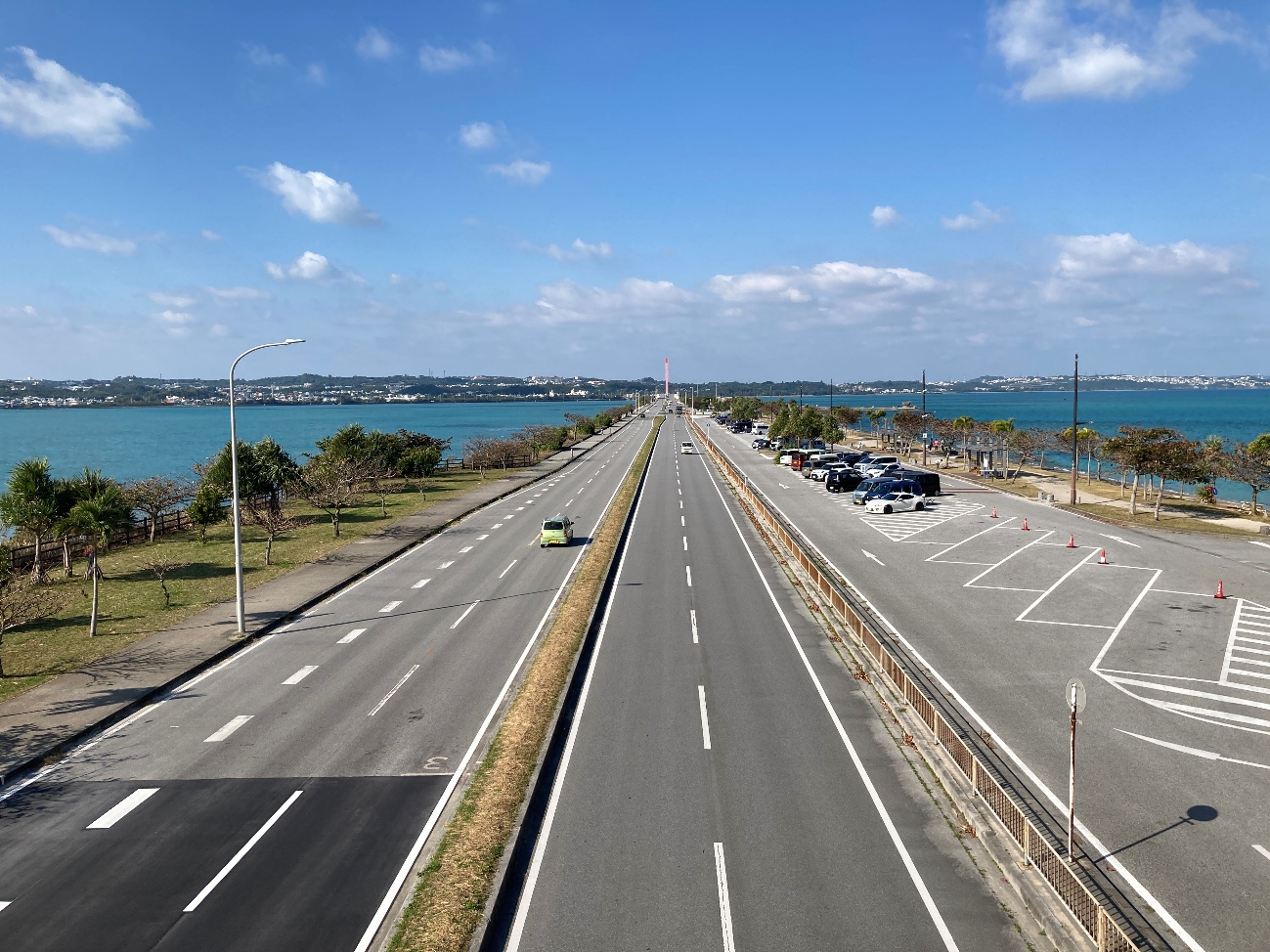 沖縄県のうるま市にある海中道路は、勝連半島と平安座島を結ぶ全長4.7kmの堤防上の道路です。 「海中」という名前ですが、実際には浅瀬を埋め立てて造られた道路で、左右に金武湾の美しいエメラルドグリーンの海が広がる絶景のドライブコースとして知られています。 ここは名護市の古宇利大橋(こうりおおはし1.96km)と違い橋ではなく堤防道路であるため、高低差が少なく、海面に近い目線で走れるのが特徴です。道路の中間地点には、船の形をした休憩施設「海の駅 あやはし館」があり、特産品の購入や食事を楽しめます。   ...