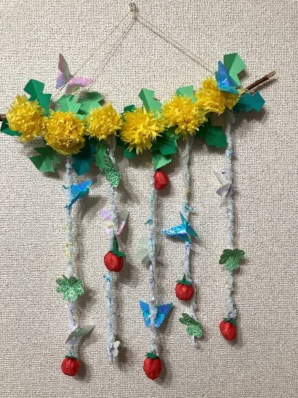 おひな様を飾ったと思ったら もう春ですね。 保育の現場では季節を先取りするのが常ですが・・・ 最近は季節の移り変わりが早すぎて とまどいます。 さて 今回は以前紹介した「部屋飾り&壁面に最適(春) 簡単 手作りたんぽぽ」 のたんぽぽを使って今回はゆらゆら揺れる 吊るし壁飾りを作りたいと思います。 【材料】 ・お花紙(黄・赤) ・モール(緑) ・マスキングテープ(緑) ・葉っぱ用色画用紙(緑) ・枝(リースや工作用棒、段ボールでも可) ・毛糸 ・折り紙(各色) ・タコ糸(吊るす用) 【作り方】 ...