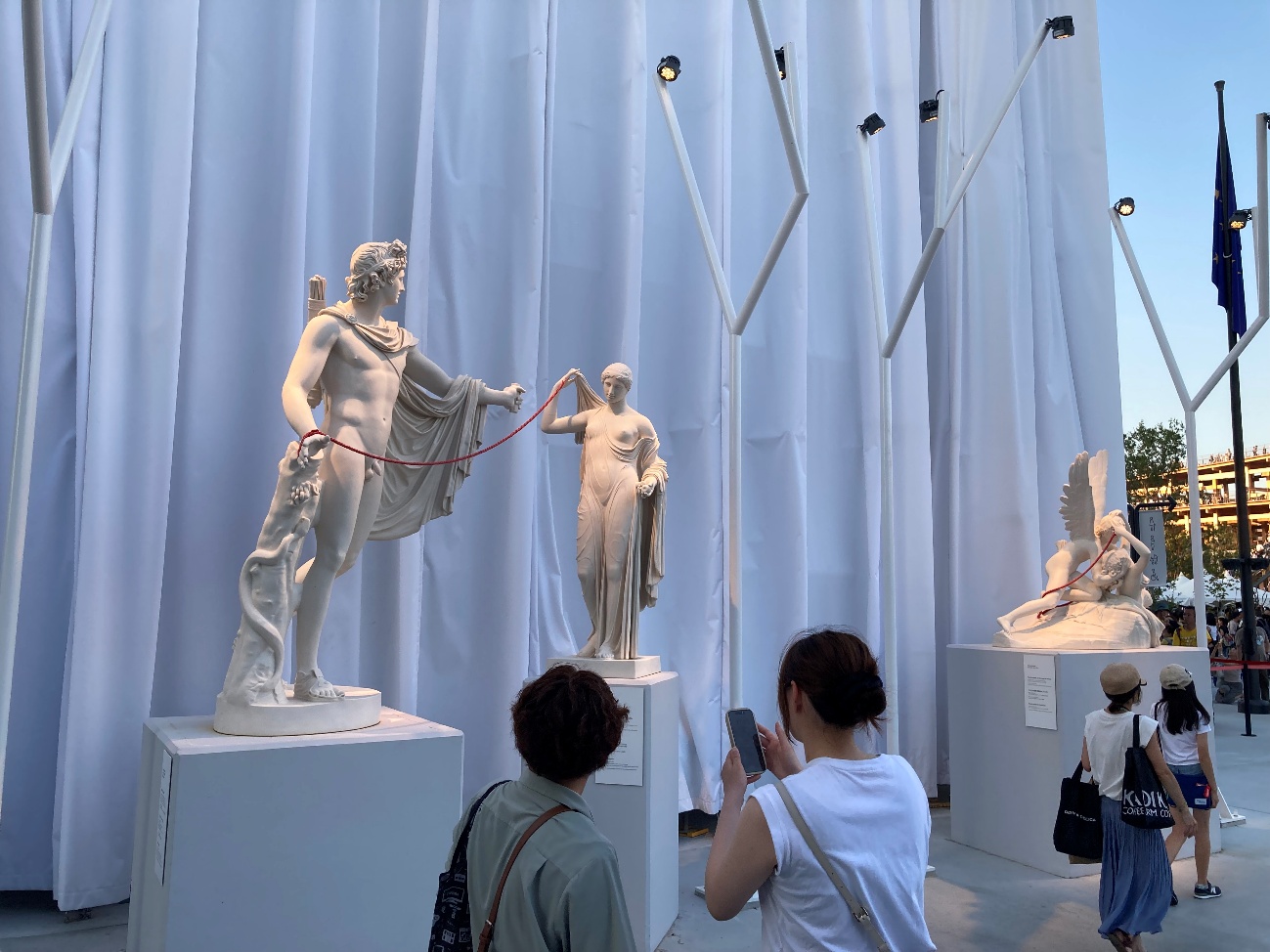 2体の古代彫刻は赤いロープで繋がれており、これは恋愛や人間関係における結びつき、あるいは束縛を象徴していると解釈されています。