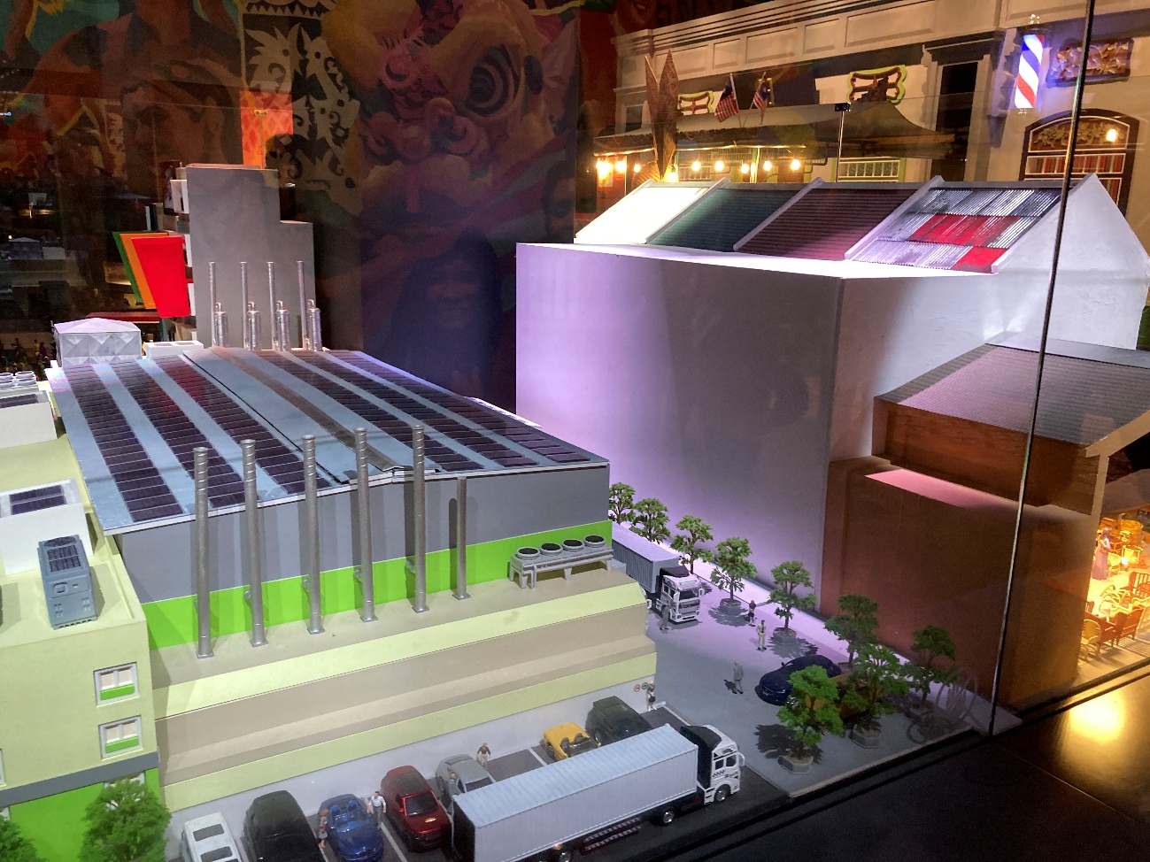 隈研吾氏設計による竹のファサードは、伝統織物ソンケットを模した幻想的なデザイン。