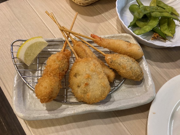 スマホオーダー形式で、ビールと枝豆・串揚げをチョイス。