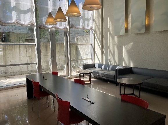 カーテンはあるもののガラス張りで(ここは モーテルの名残???)と思わせる造りです。