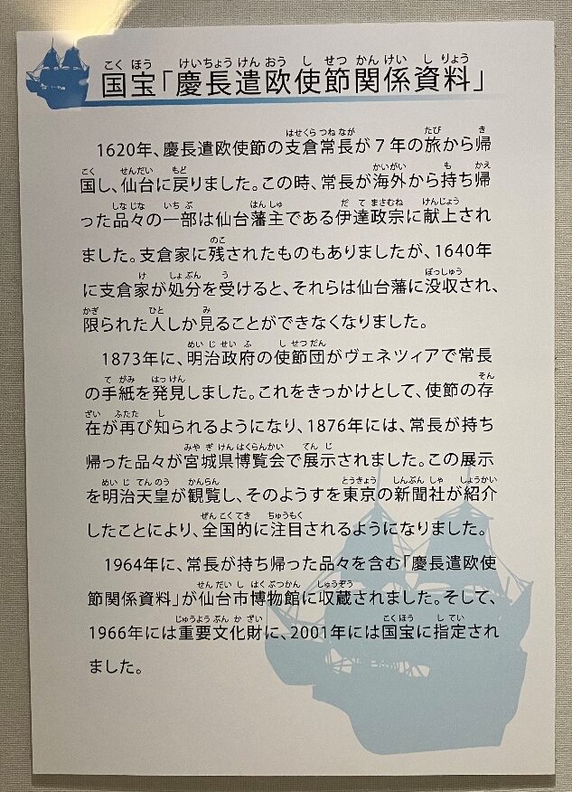 1964年に、 常長が持ち帰った品々を含む「慶長遣欧使節関係資料」 が仙台市博物館に収蔵されました。 1966年には重要文化財に、2001年には国宝に指定されました。