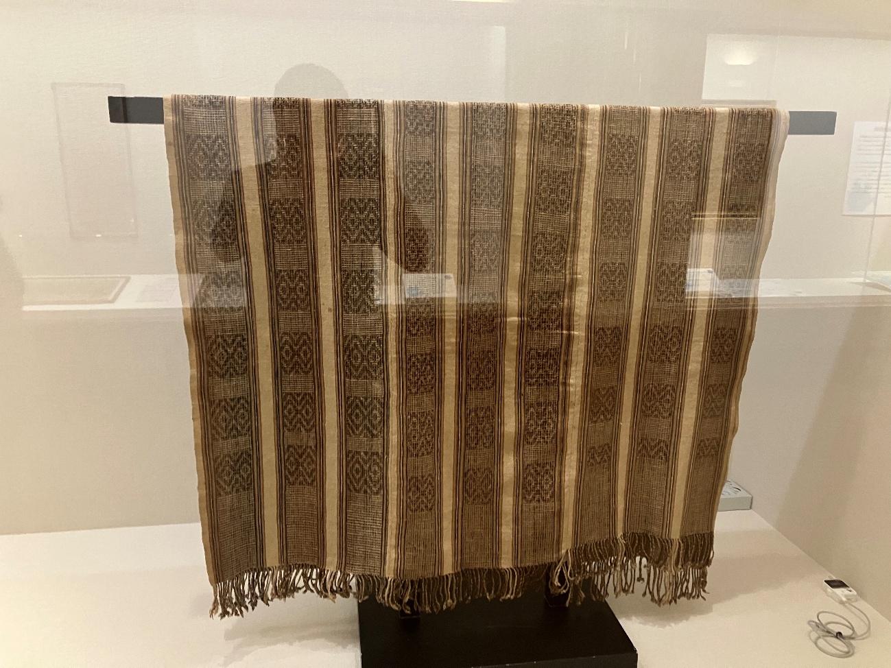 幾何学模様を織り出した木綿製の布。織 リ幅や、端を結んで始末する方法などから、 フィリピンでつくられた可能性が高い。