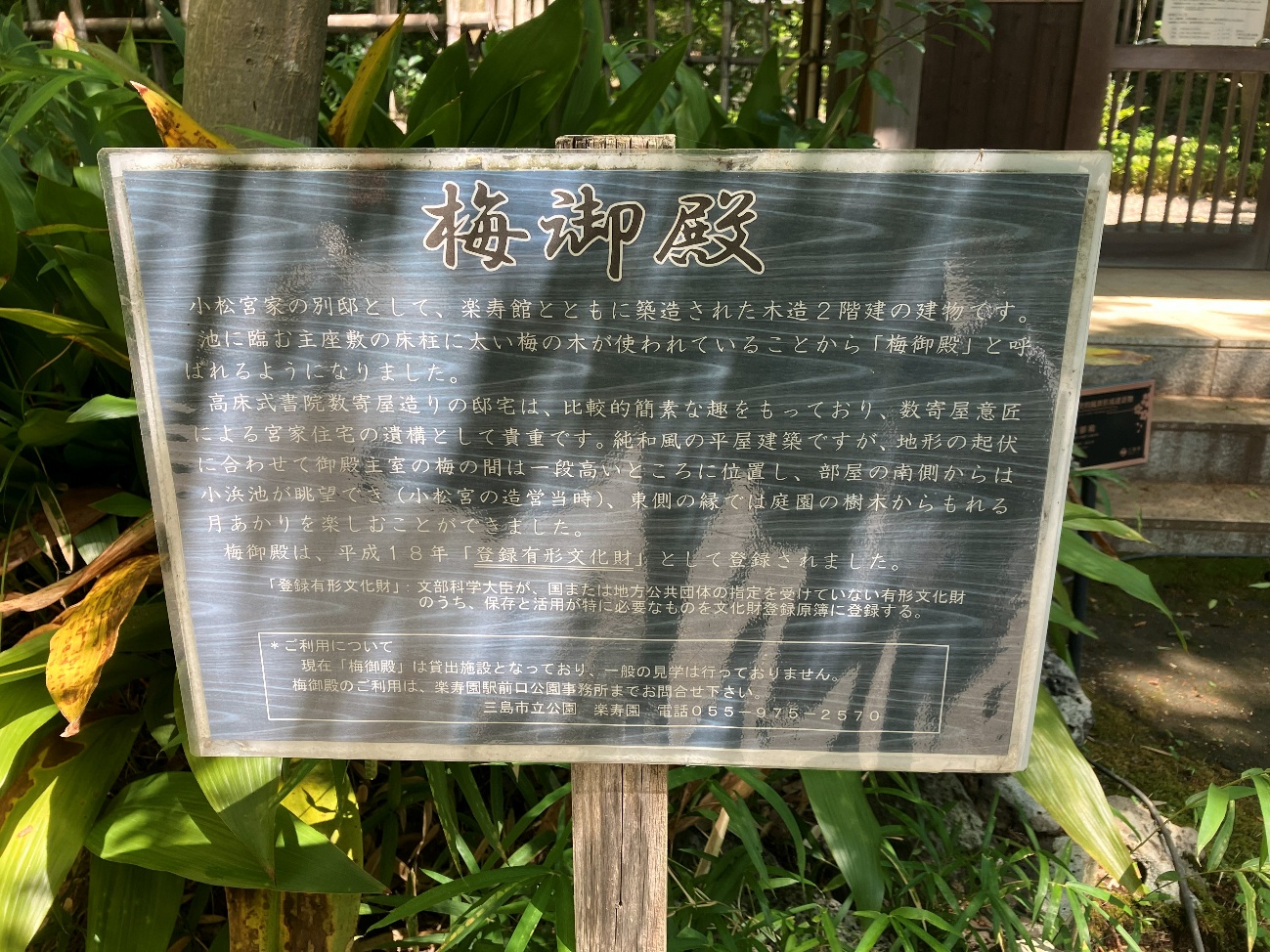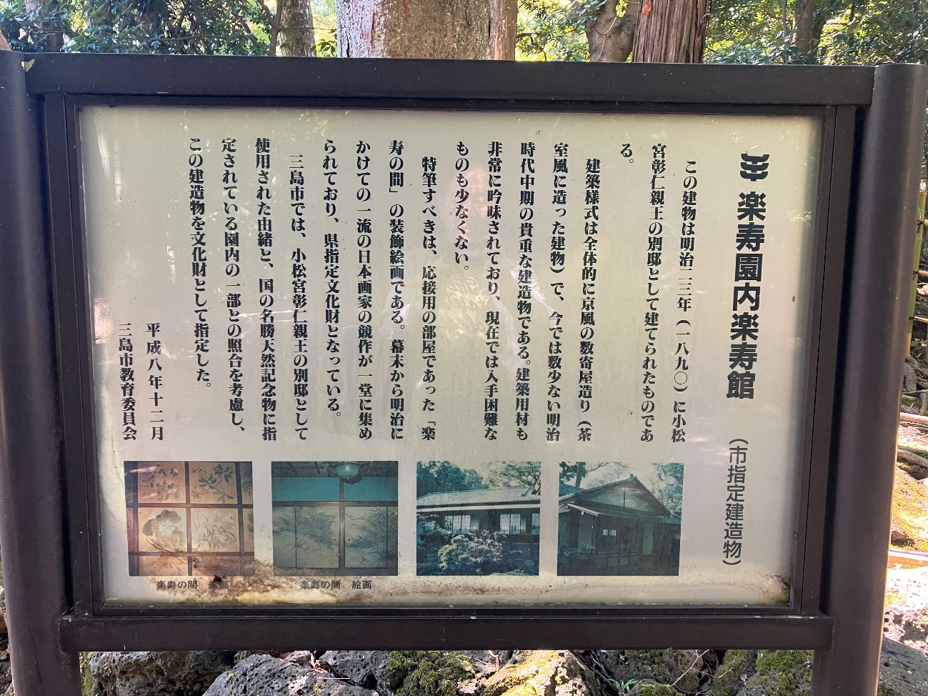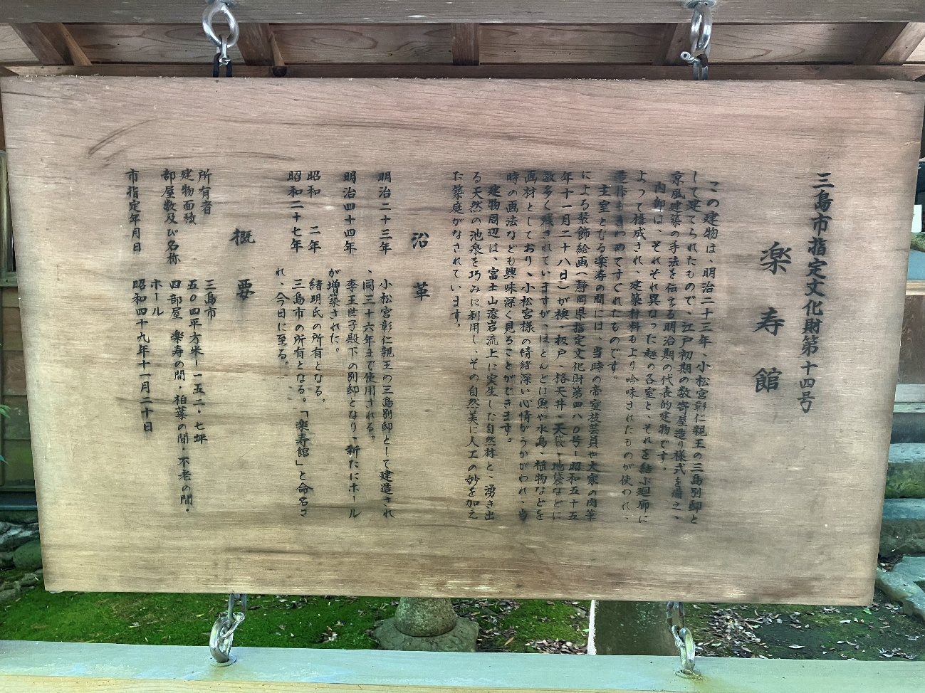 明治二三年(一八九〇)に小松宮彰仁親王別邸がここに築かれ、その後明治四四年李王世子殿下別邸、昭和に入って個人の所有となったが、昭和二七年(一九五二) 三島市立公園 「楽寿園」として市民に公開された。