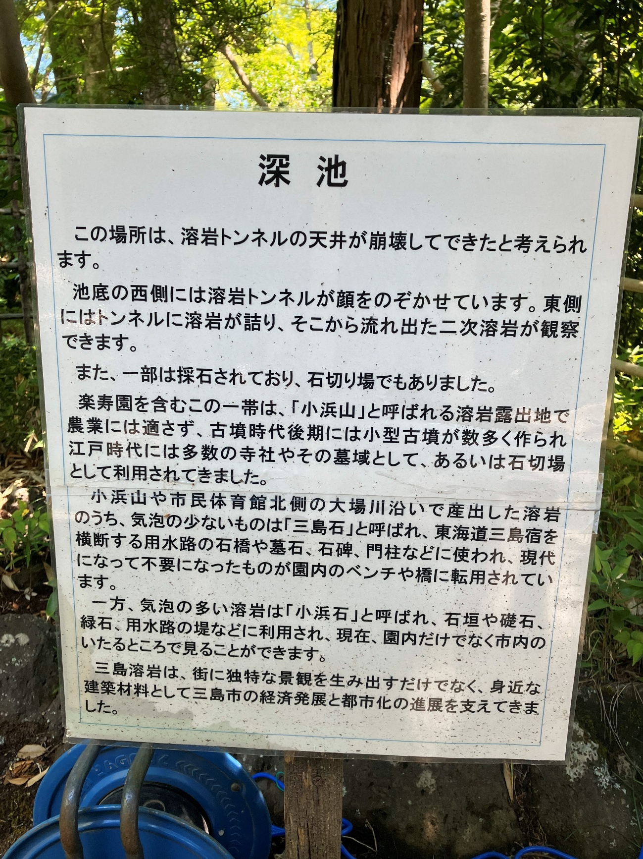 六万㎡におよぶ楽寿園は、小浜池を中心とする富士山の基底溶岩流の末端にあるという溶岩地形と、その溶岩中から数か所にわたって地下水が湧出している現象が天然記念物として指定されている。