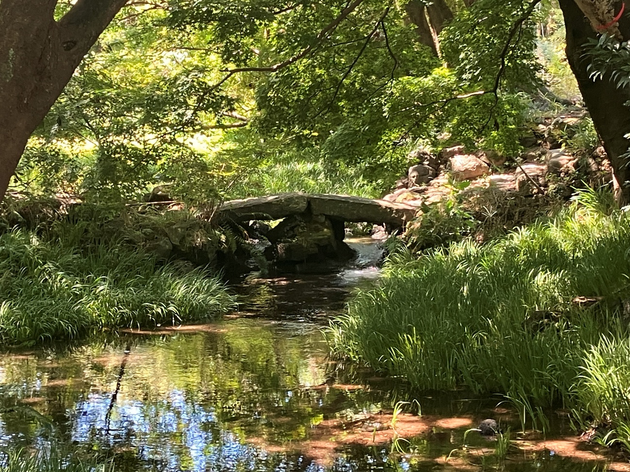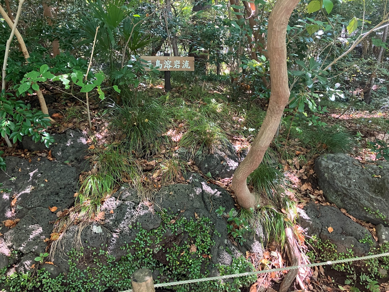 小浜山や市民体育館北側の大場川沿いで産出した溶岩のうち、気泡の少ないものは「三島石」と呼ばれ、 東海道三島宿を横断する用水路の石橋や墓石、石碑、 門柱などに使われ、 現代になって不要になったものが園内のベンチや橋に転用されています。
