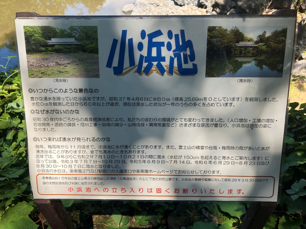 小浜池の水位は、 楽寿園正門及び駅前口の入園窓口や楽寿園ホームページでお知らせしております。