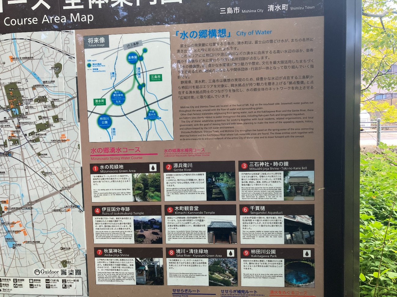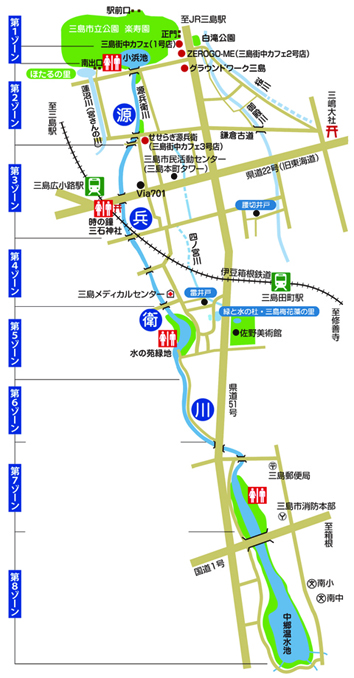 このエリアには柿田川や源兵衛川などの湧水に由来する名高い水辺のほか、 楽寿園や千樋など水に関わりの深い名所旧跡が点在します。
