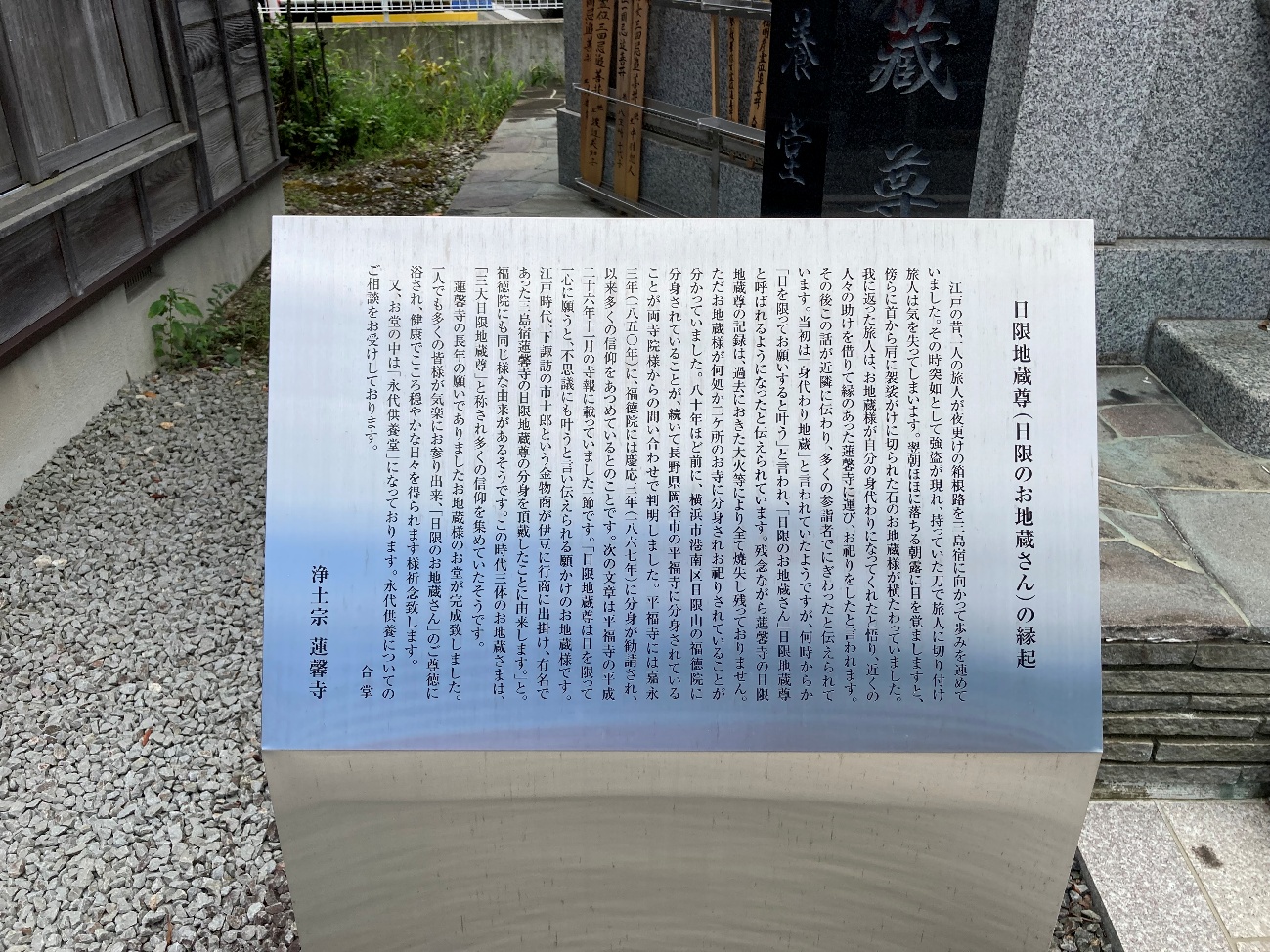 江戸時代、下諏訪の市十郎という金物商が伊豆に行商に出掛け、有名であった三島宿蓮馨寺の日限地蔵尊の分身を頂戴したことに由来します。」と。