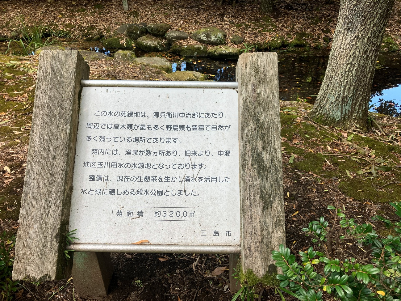 この水の苑緑地は、 源兵衛川中流部にあたり、周辺では高木類が最も多く野鳥類も豊富で自然が多く残っている場所であります。