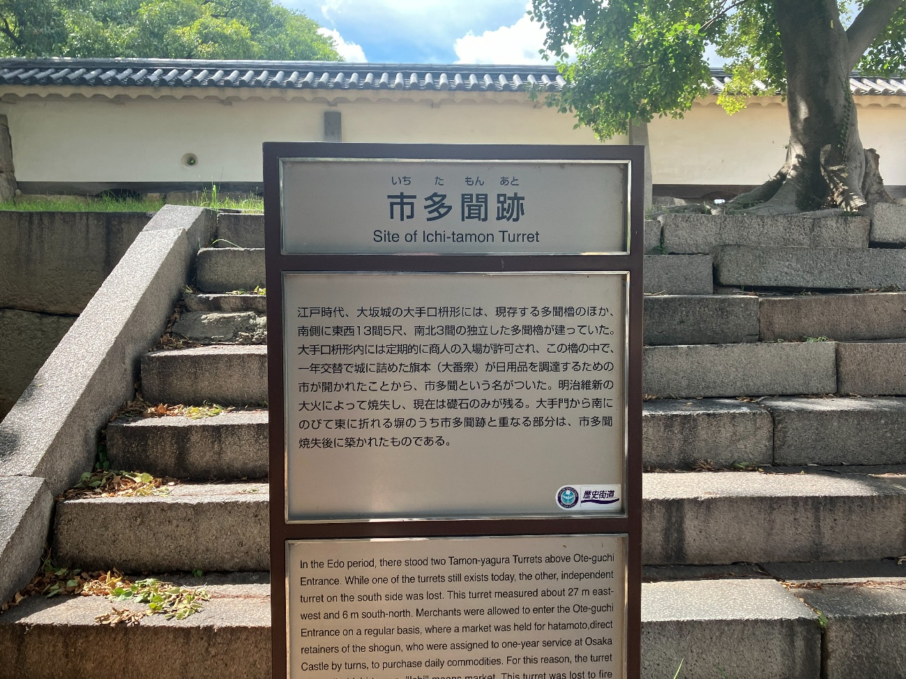 大手口枡形内には定期的に商人の入場が許可され、この櫓の中で、一年交替で城に詰めた旗本 (大番衆) が日用品を調達するための市が開かれたことから、 市多聞という名がついた。