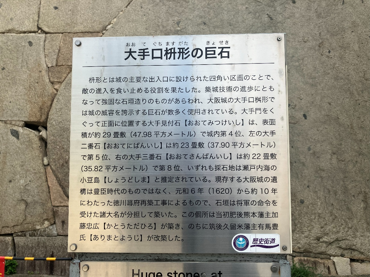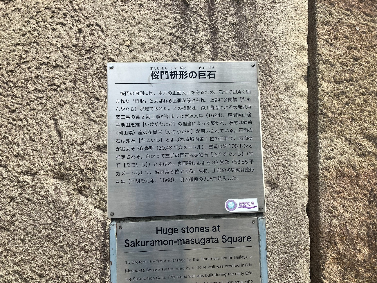 この枡形は、徳川幕府による大坂城再築工事の第2期工事が始まった寛永元年(1624)、 備前岡山藩主池田忠雄 【いけだただお】 の担当によって築かれ、 石材は備前(岡山県)産の花崗岩 【かこうがん】 が用いられている。