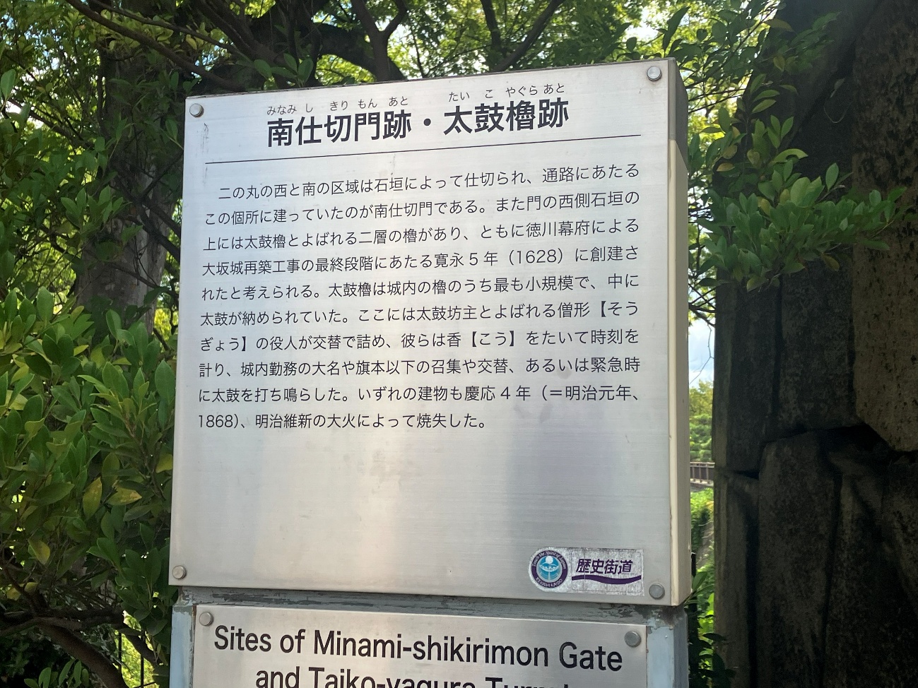 また門の西側石垣の上には太鼓櫓とよばれる二層の櫓があり、ともに徳川幕府による大坂城再築工事の最終段階にあたる寛永5年(1628) に創建されたと考えられる。