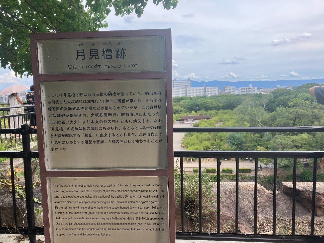 徳川幕府が再築した大坂城には本丸に11棟の三層櫓が築かれ、それぞれ備蓄用の武器武具や兵糧などが納められていたが、この月見櫓には鉄砲が保管され、 大坂鉄砲奉行が維持管理にあたった。