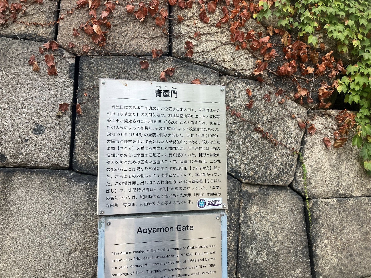 青屋口は大阪城二の丸の北に位置する出入口で、青屋門はその枡形 【ますがた」 の内側に建つ。創建は徳川幕府による大坂城再築工事が開始された元和6年(1620) と考えられ、 明治維新の大火によって被災し、 その後陸軍によって改築されたものの、昭和20年(1945) の空襲で再び大破した。