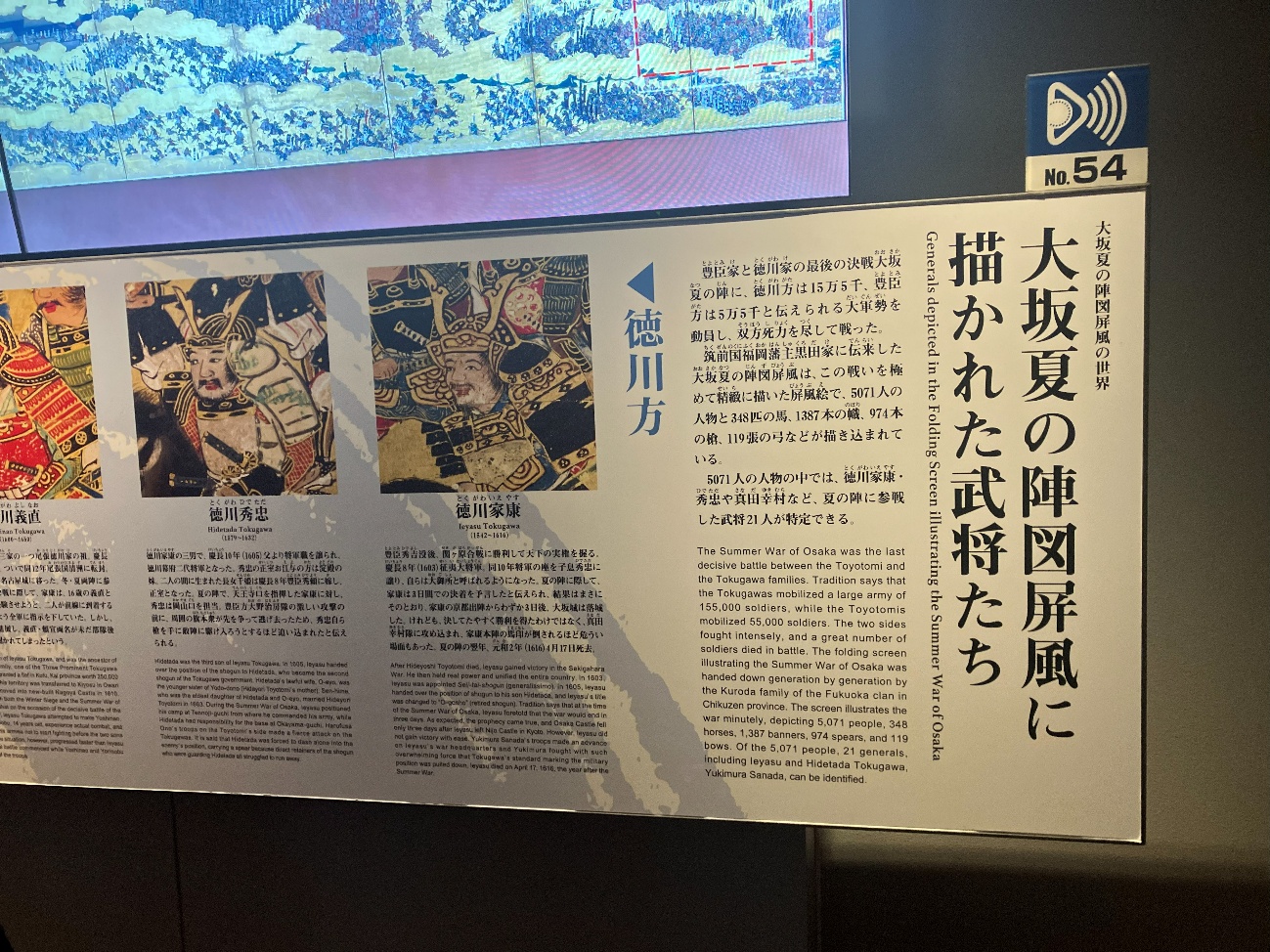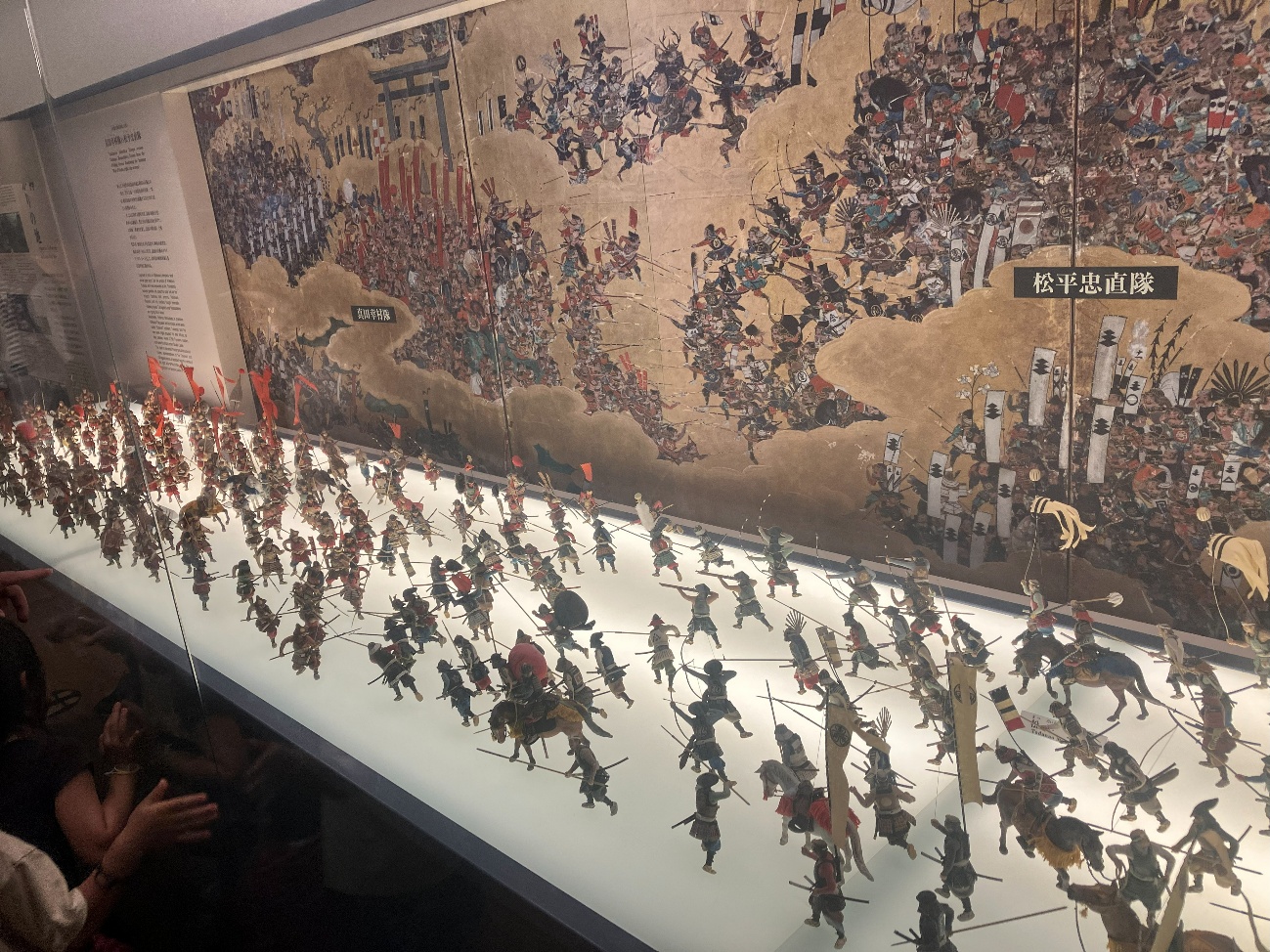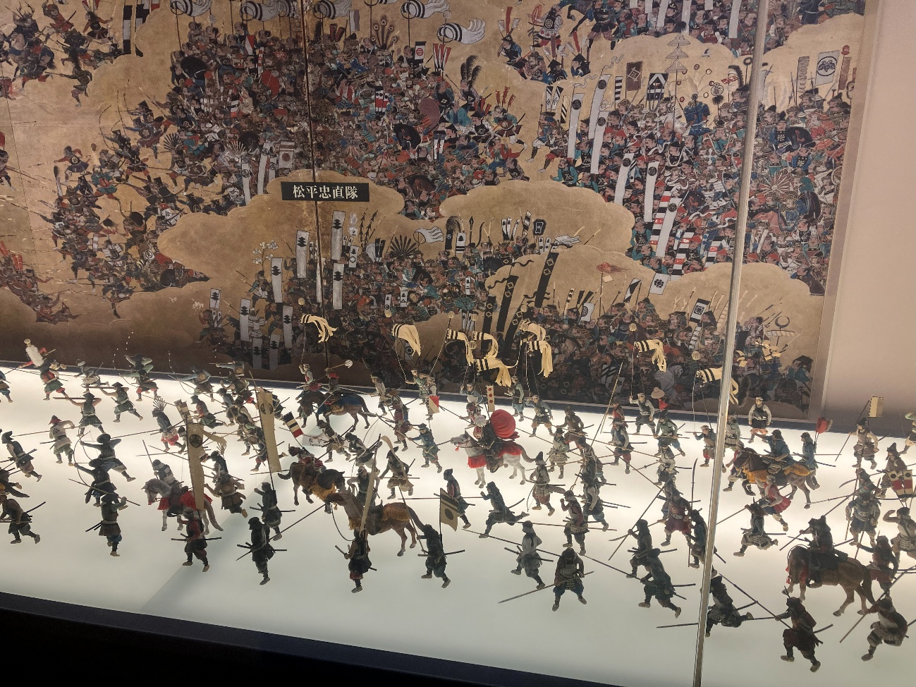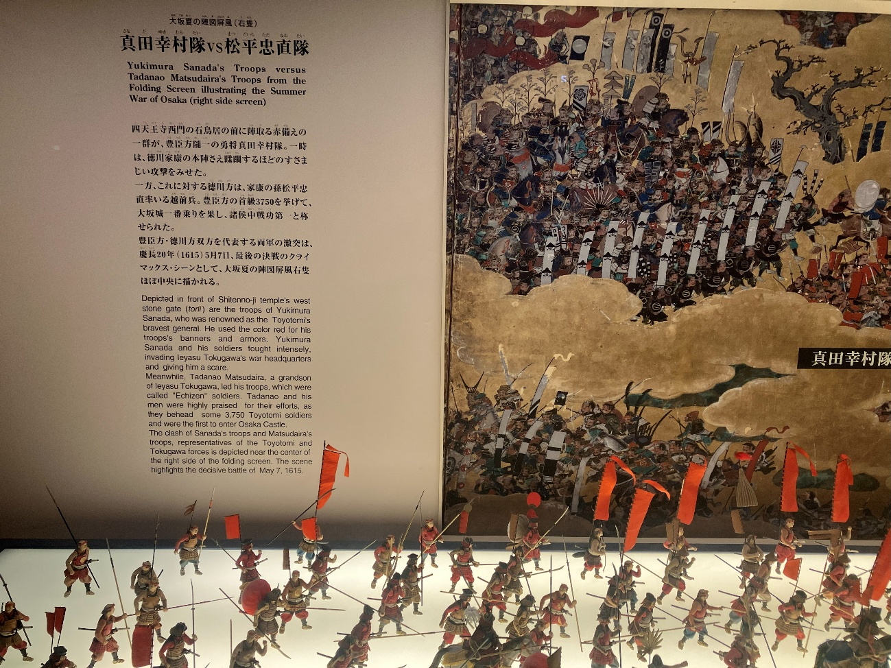 大坂夏の陣図屏風にもとづき真田幸村隊(158体)と松平忠直隊(149体) の激戦をミニチュア人形(計307体 スケール1/20)で再現しています。