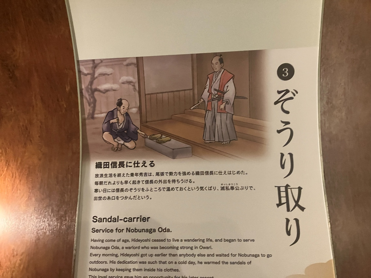 毎朝だれよりも早く起きて信長の外出を待ちうける。寒い日には信長のぞうりをふところで温めておくという気くばり、滅私奉公ぶりで、出世の糸口をつかんだという。