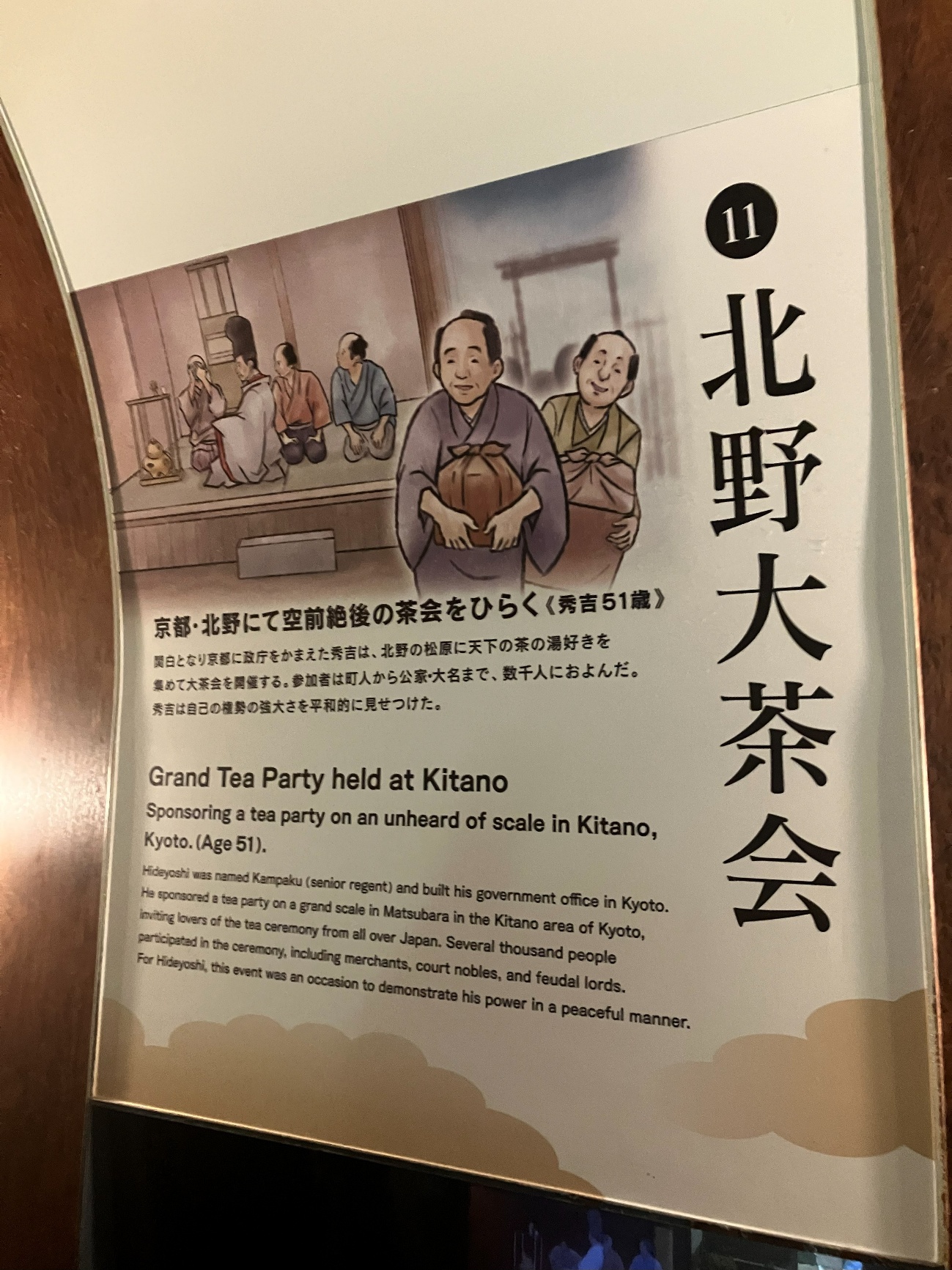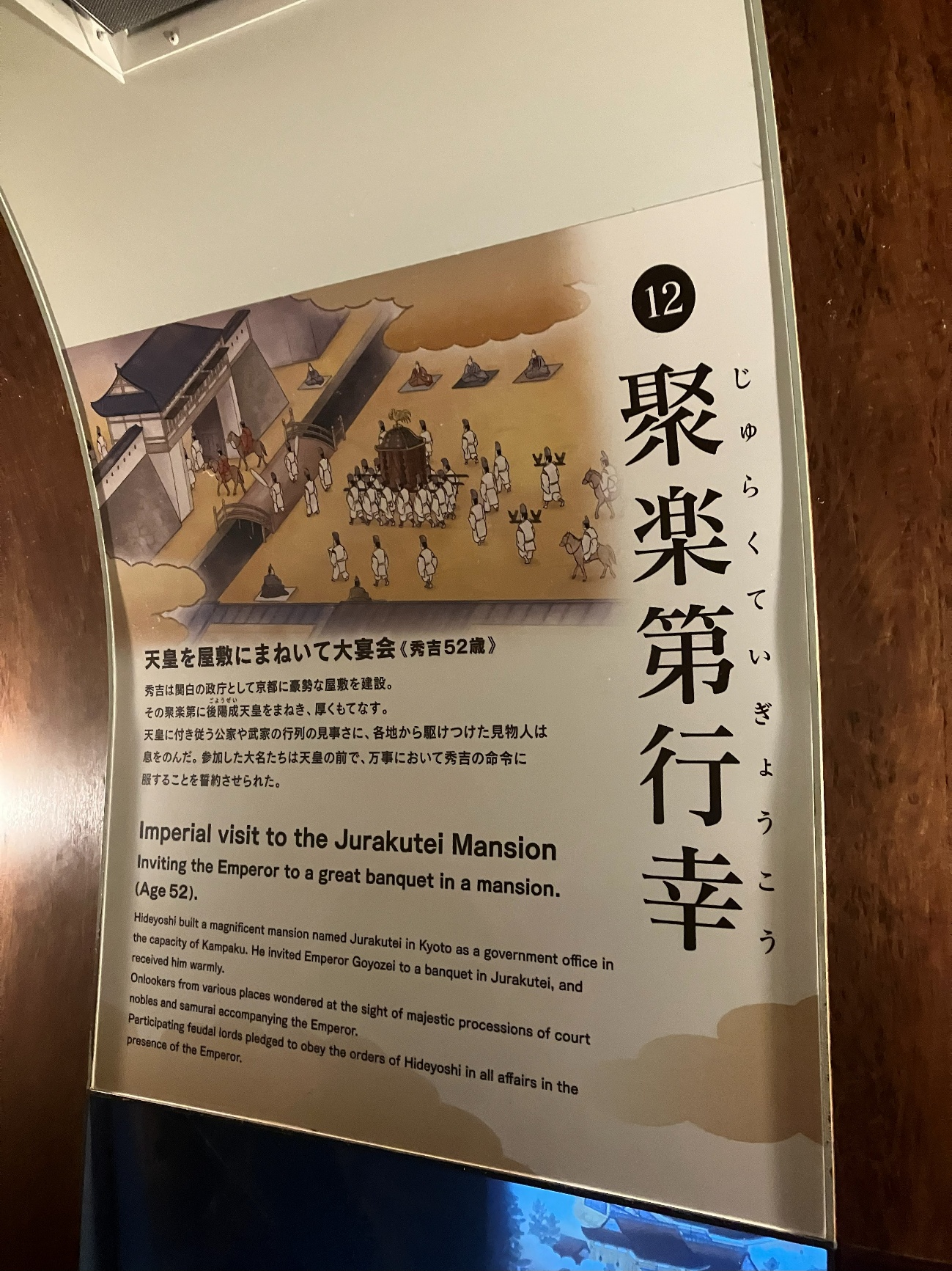 天皇に付き従う公家や武家の行列の見事さに、 各地から駆けつけた見物人は息をのんだ。参加した大名たちは天皇の前で、万事において秀吉の命令に服することを誓約させられた。