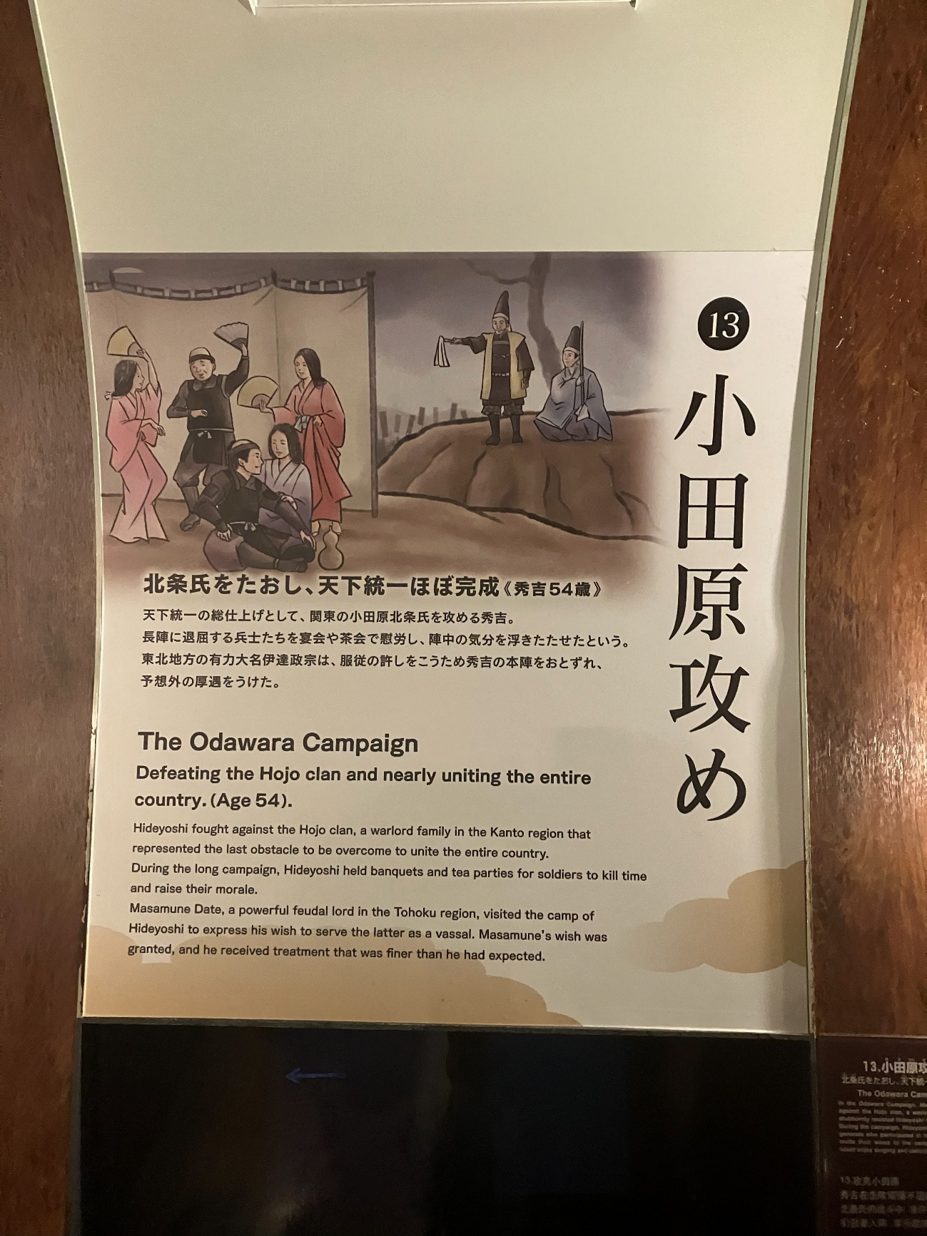 東北地方の有力大名伊達政宗は、 服従の許しをこうため秀吉の本陣をおとずれ、予想外の厚遇をうけた。