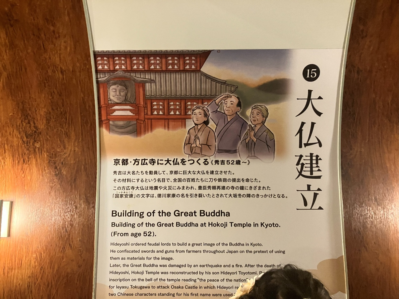 この方広寺大仏は地震や火災にみまわれ、 豊臣秀頼再建の寺の鐘にきざまれた「国家安康」の文字は、徳川家康の名を引き裂いたとされて大坂冬の陣のきっかけとなる。