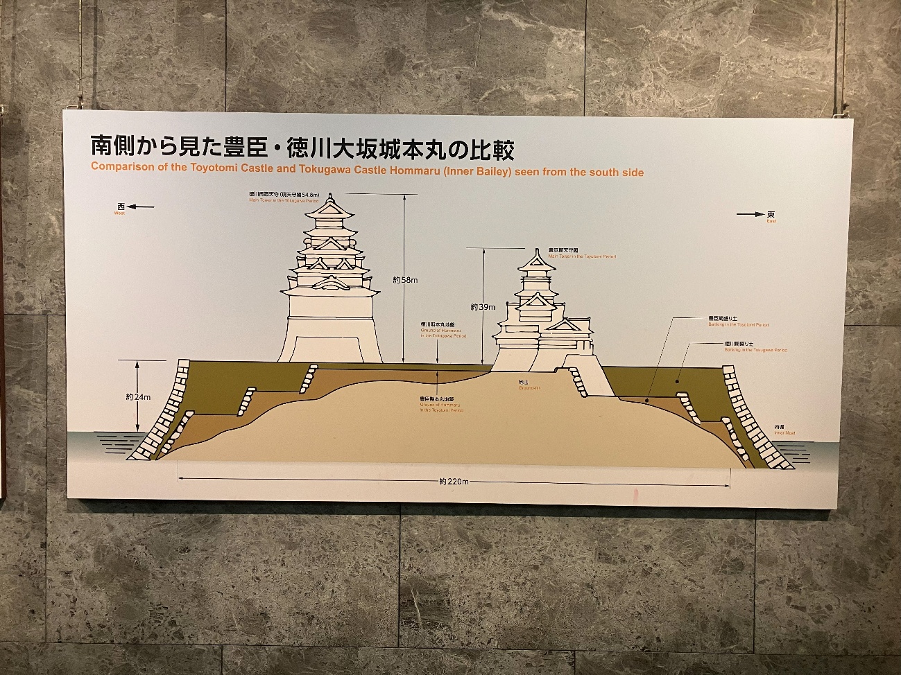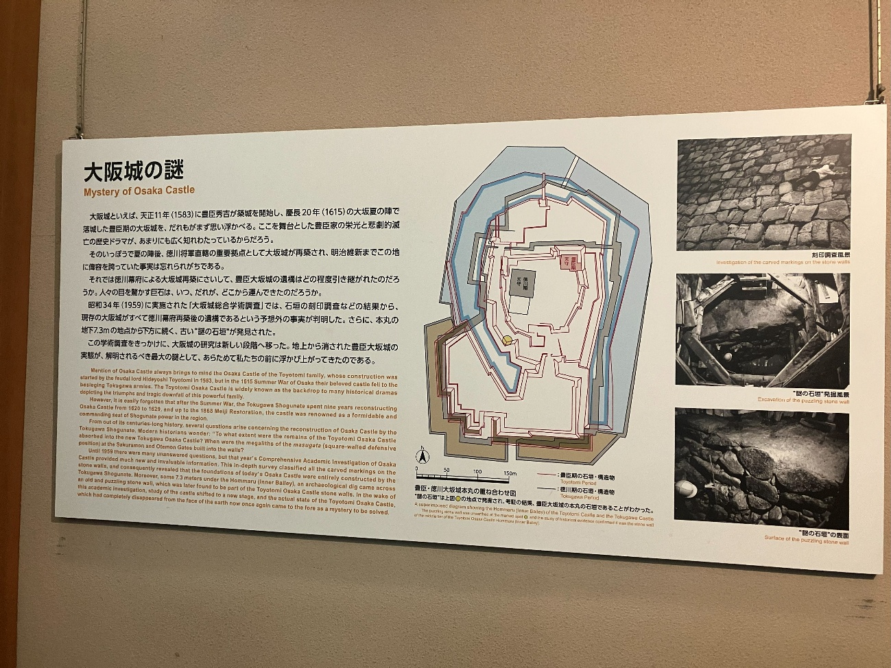 昭和34年(1959) に実施された 「大坂城総合学術調査」 では、 石垣の刻印調査などの結果から、現存の大阪城がすべて徳川幕府再築後の遺構であるという予想外の事実が判明した。さらに、本丸の地下7.3mの地点から下方に続く、 古い “謎の石垣”が発見された。