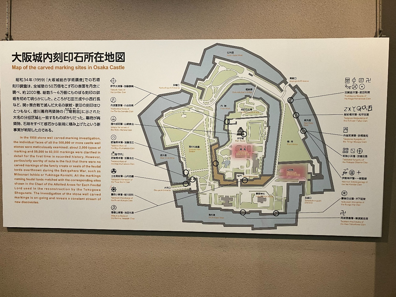 昭和34年(1959) 「大坂城総合学術調査」での石垣刻印調査は、 全城壁の50万個をこす石の表面を丹念に調べ、 約2000種、 総数5~6万個にものぼる刻印の詳細を初めて明らかにした。