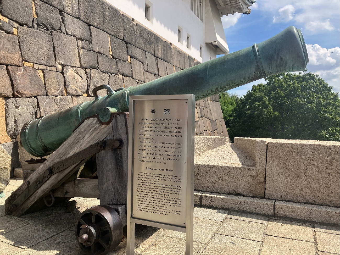明治3年(1870)から時刻を知らせる号砲として用いられ、はじめは日に3度、 明治7年からは正午のみ空砲大阪市内にとどろきわたり、「お城のドン」 「お午のドン」の名で市民に親しまれた。