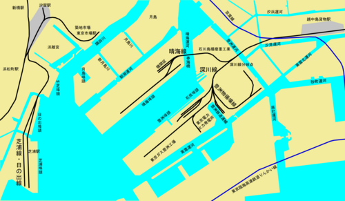 やがて路線を分岐させ主に雑貨類を扱う「豊洲物揚場線(とよすものあげばせん)」、食料品などを扱う「晴海線」を開業しました。