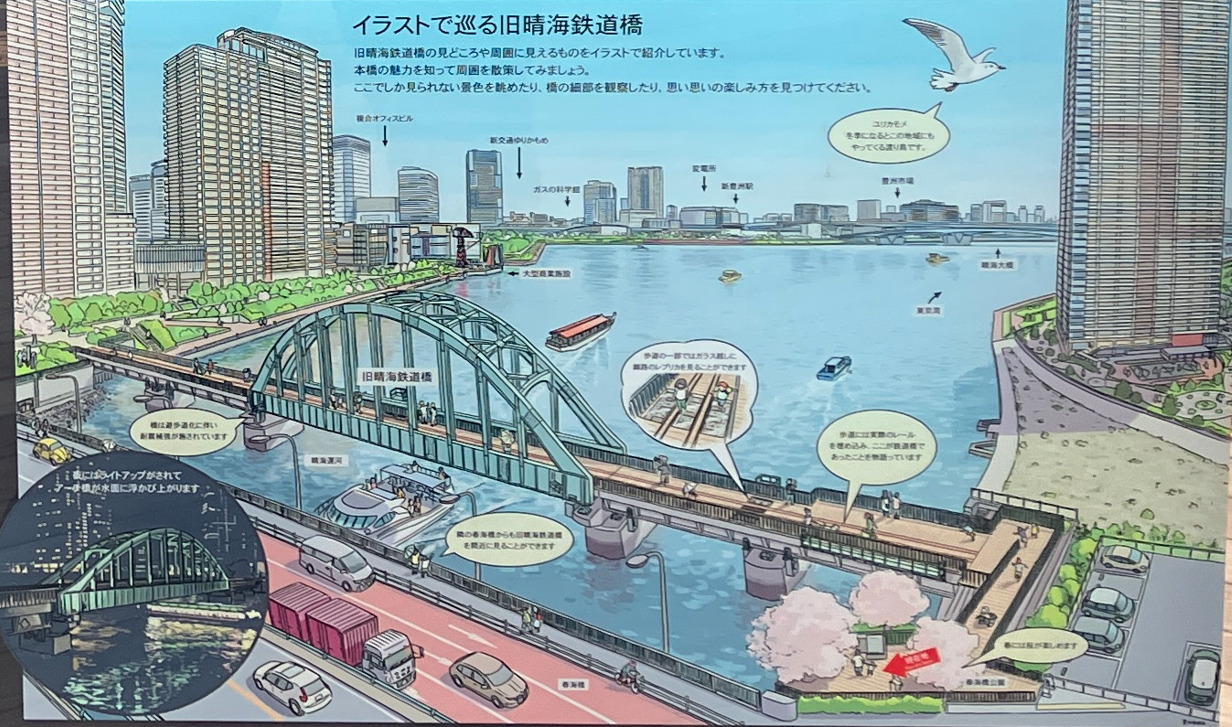 戦後の橋梁建造技術の原点のひとつとなった旧晴海鉄道橋は、平成元年(1989)の供用廃止から35年余りの時を経て、遊歩道として整備され、 生まれ変わりました。