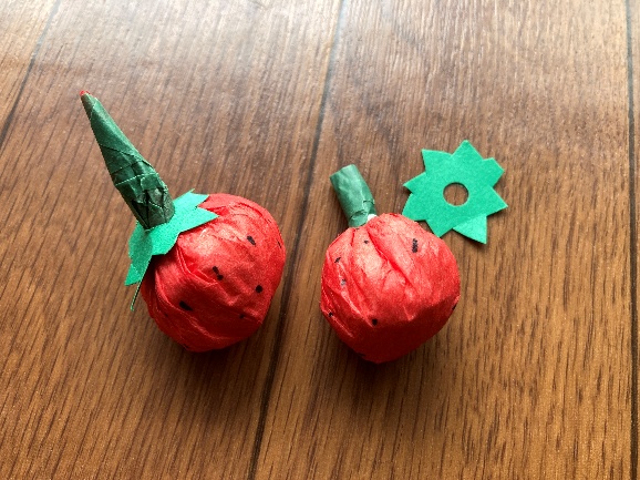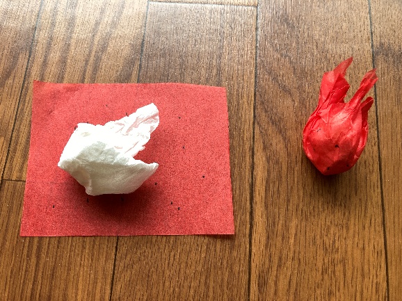 ティッシュを丸め、赤色のお花紙でくるみました。