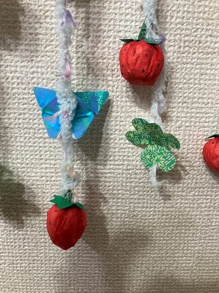 • ⑥ 先にタコ糸、毛糸を縛ってから、タンポポ→チョウチョ、いちご、クローバーをボンドやグルーガンで停めていきます。