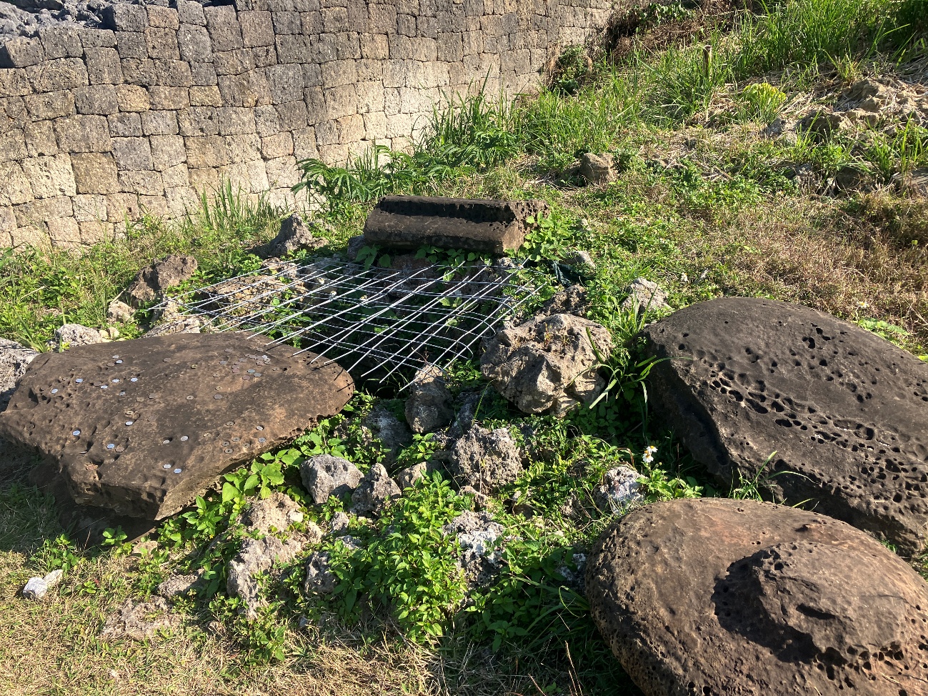 また、建物の四隅には長方形の石灰岩による石積みが発見されています。この石積みは、 建物と同時にあったと考えられていますが、機能についてはわかっていません。