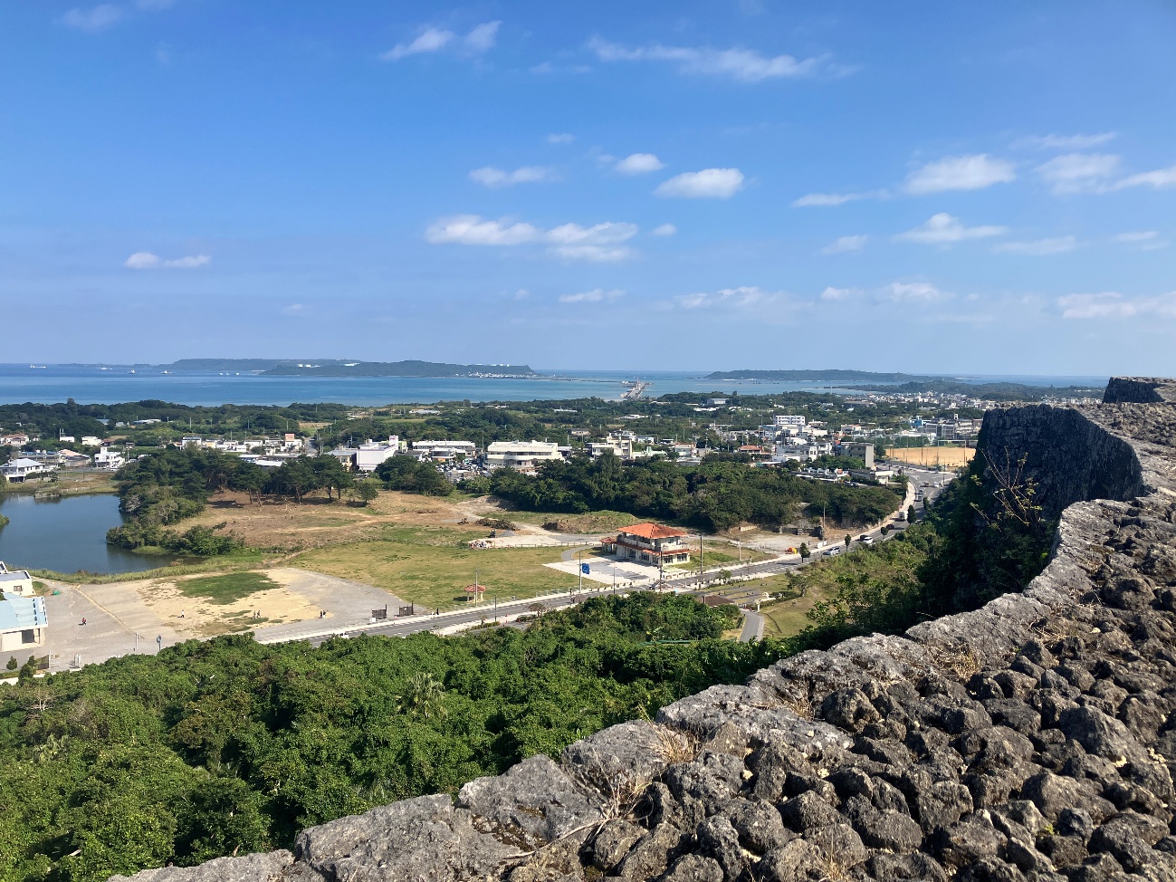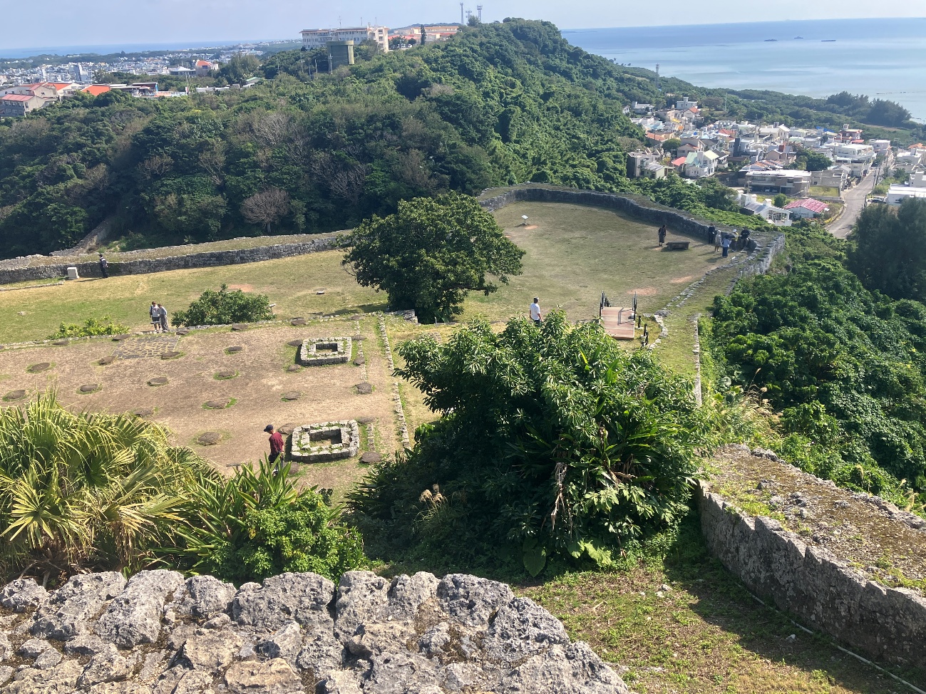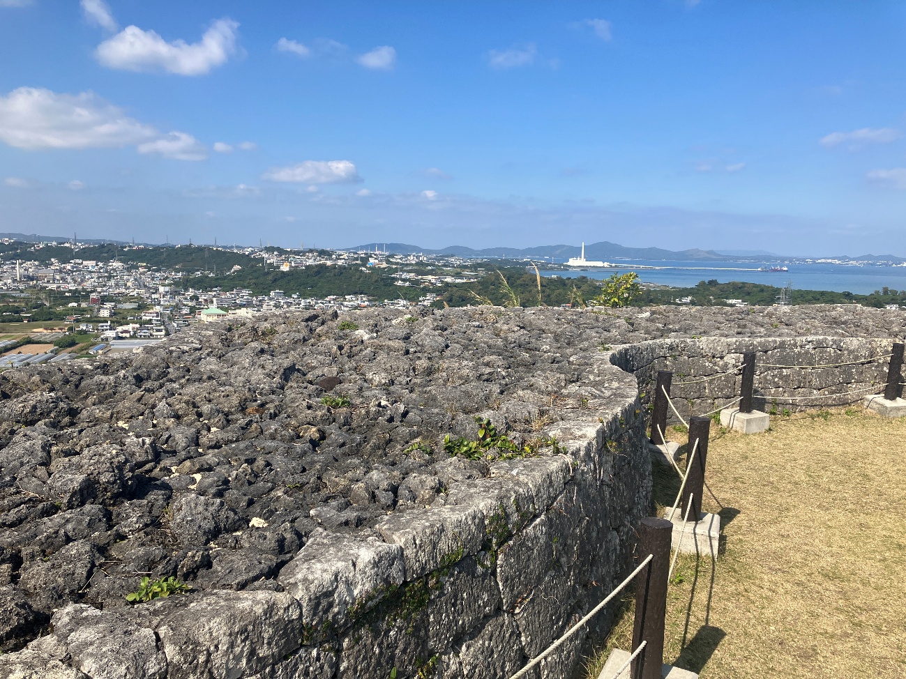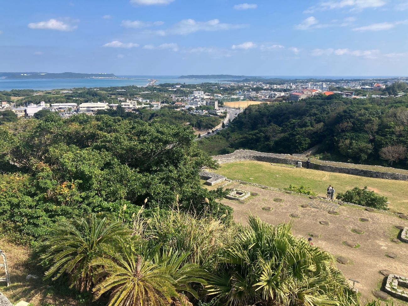 勝連城は、五つの輪からなり、最も高い曲輪に上ると、北は遥か金武湾(きんわん)を囲む山の山々や太平洋の島々が望まれ、南は知念半島や中城湾、それを隔てて護佐丸の城である中城城が一望できる景勝地になってます。