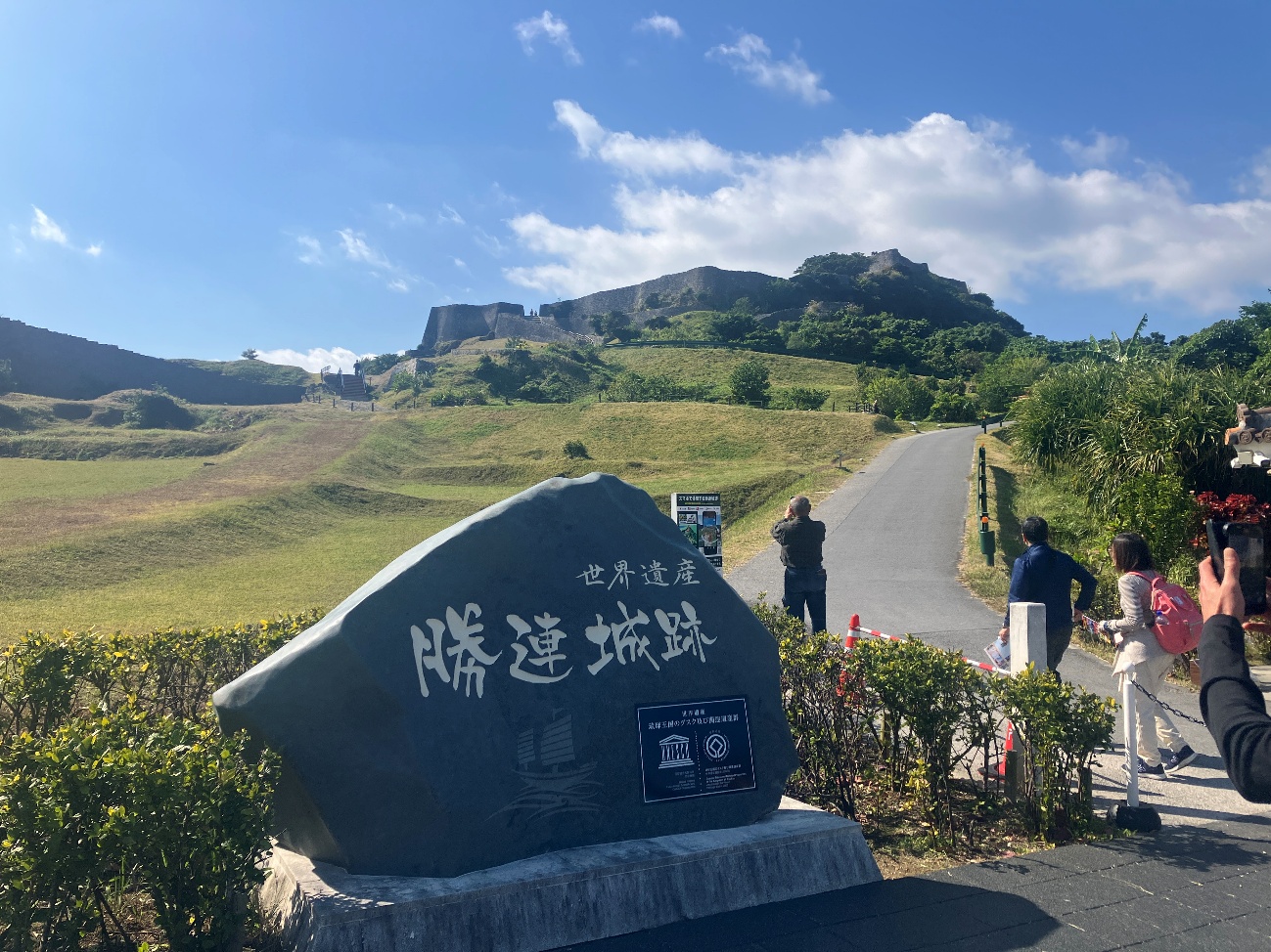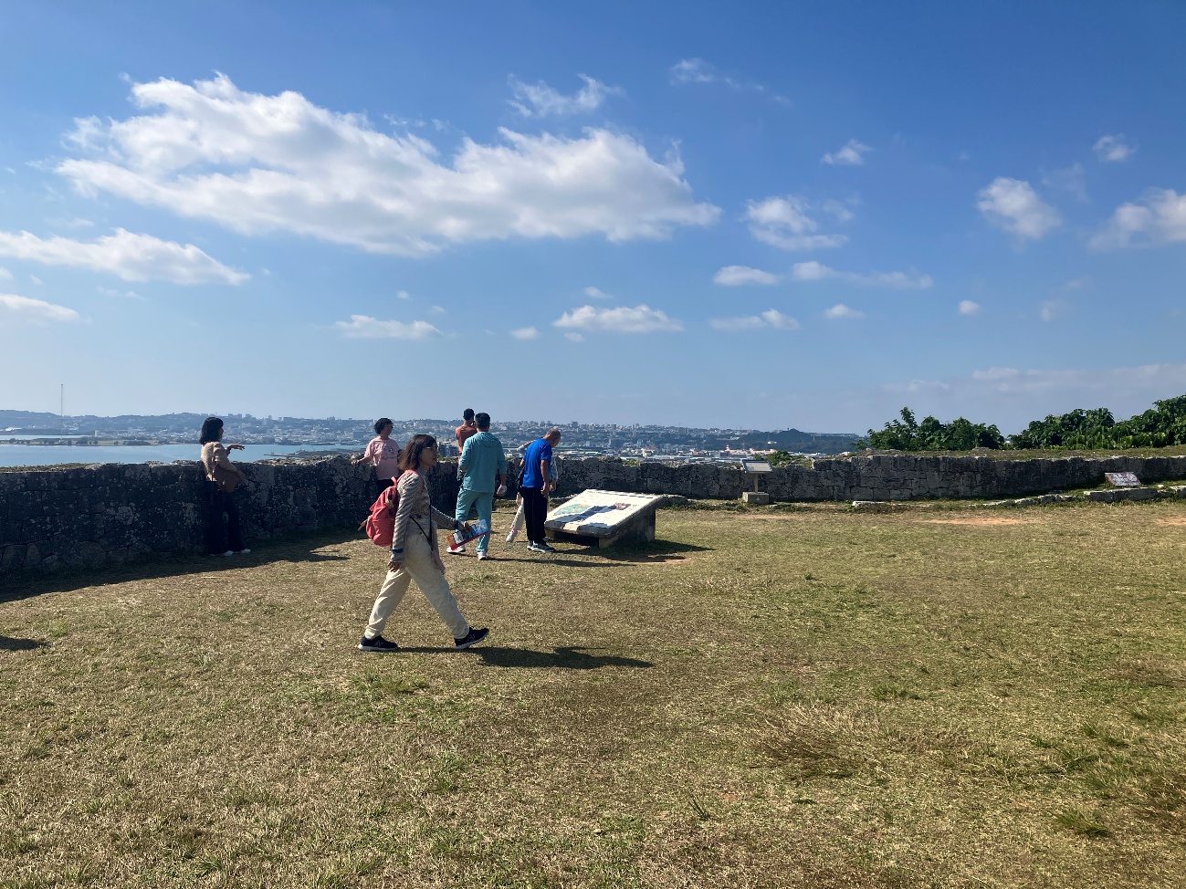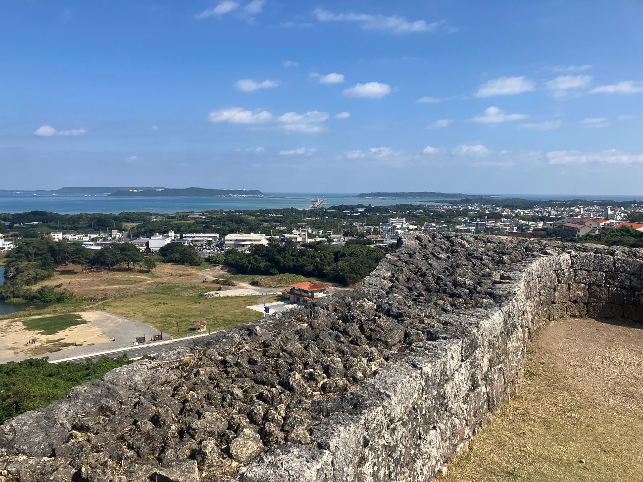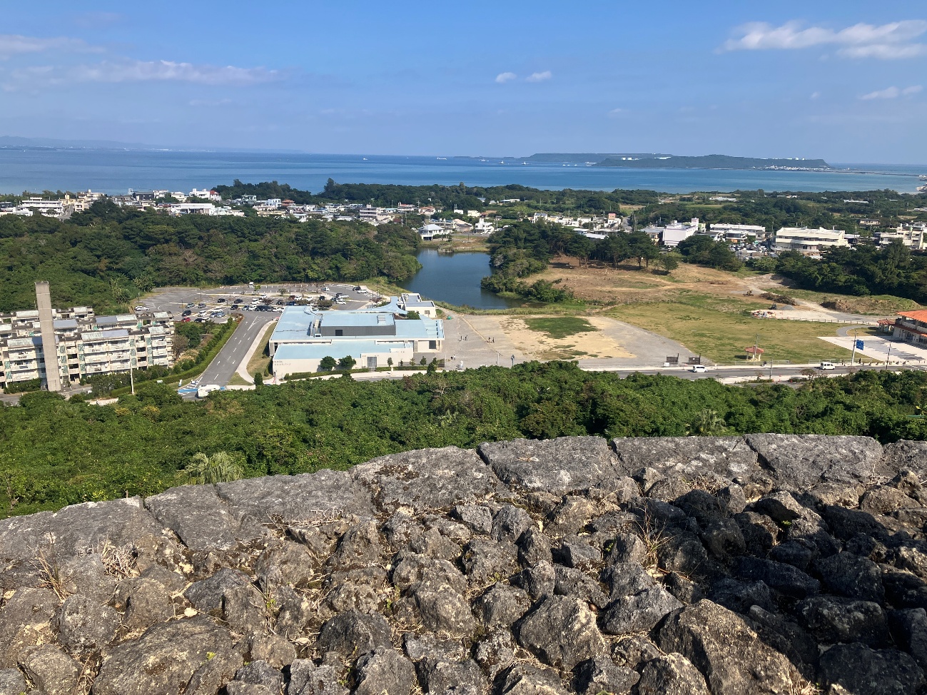 勝連城は、五つの輪からなり、最も高い曲輪に上ると、北は遥か金武湾(きんわん)を囲む山の山々や太平洋の島々が望まれ、南は知念半島や中城湾、それを隔てて護佐丸の城である中城城が一望できる景勝地になってます。