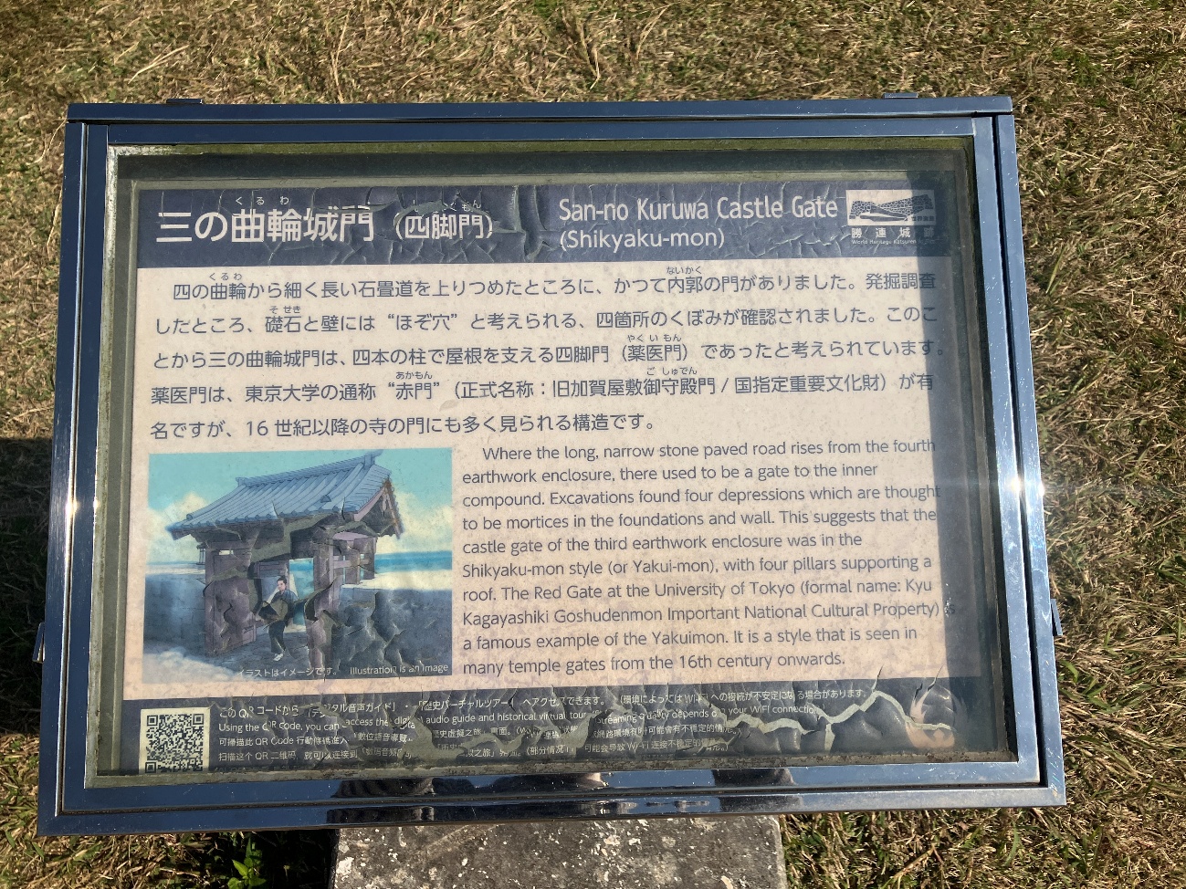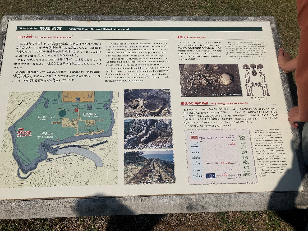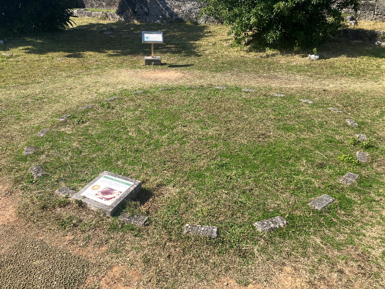 城門脇の城壁に接したところからグスク時代に属する幼児の人骨が折り曲がった状態で発掘されています。
