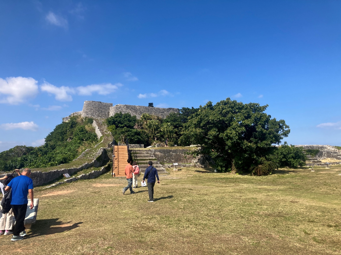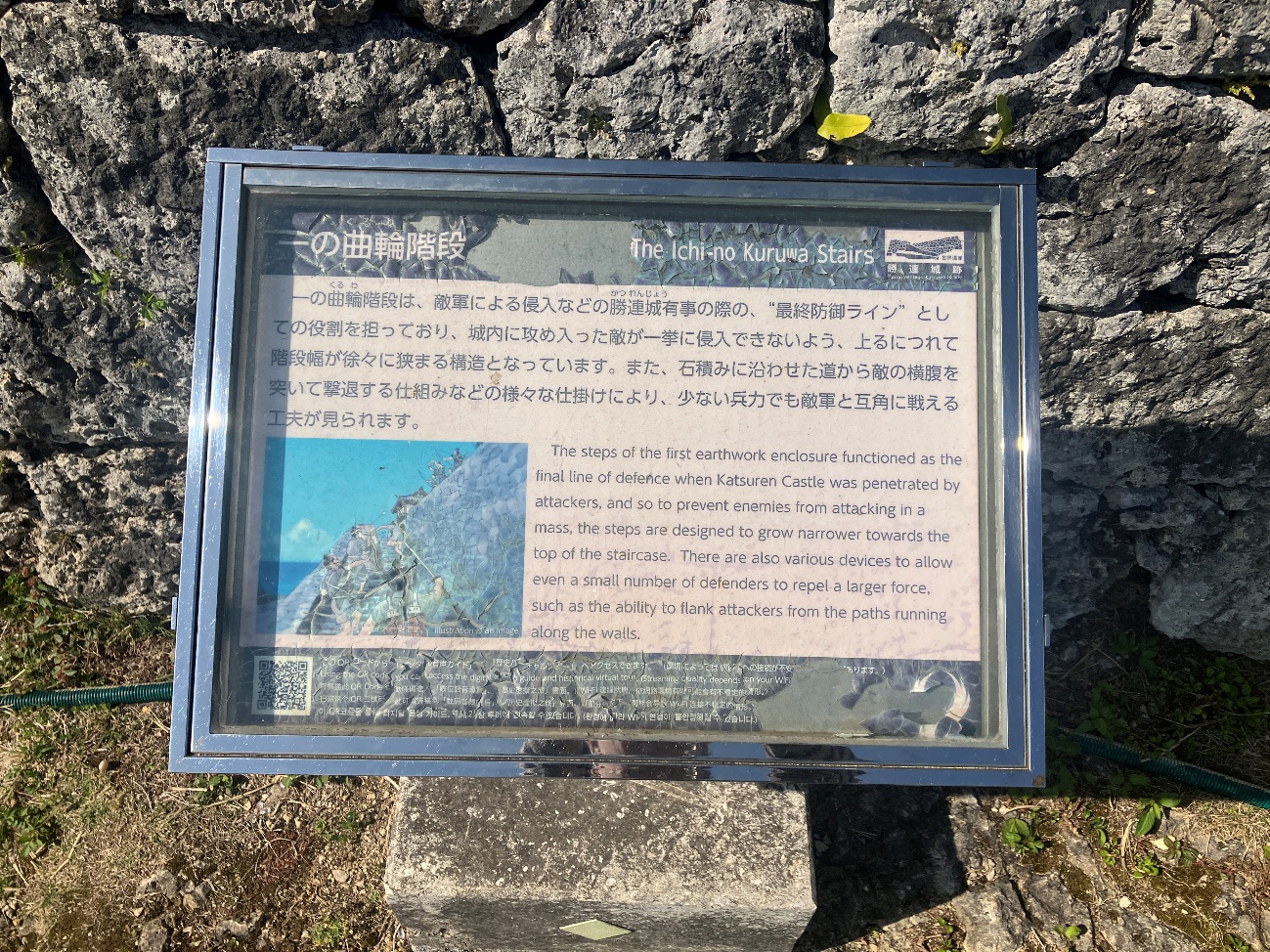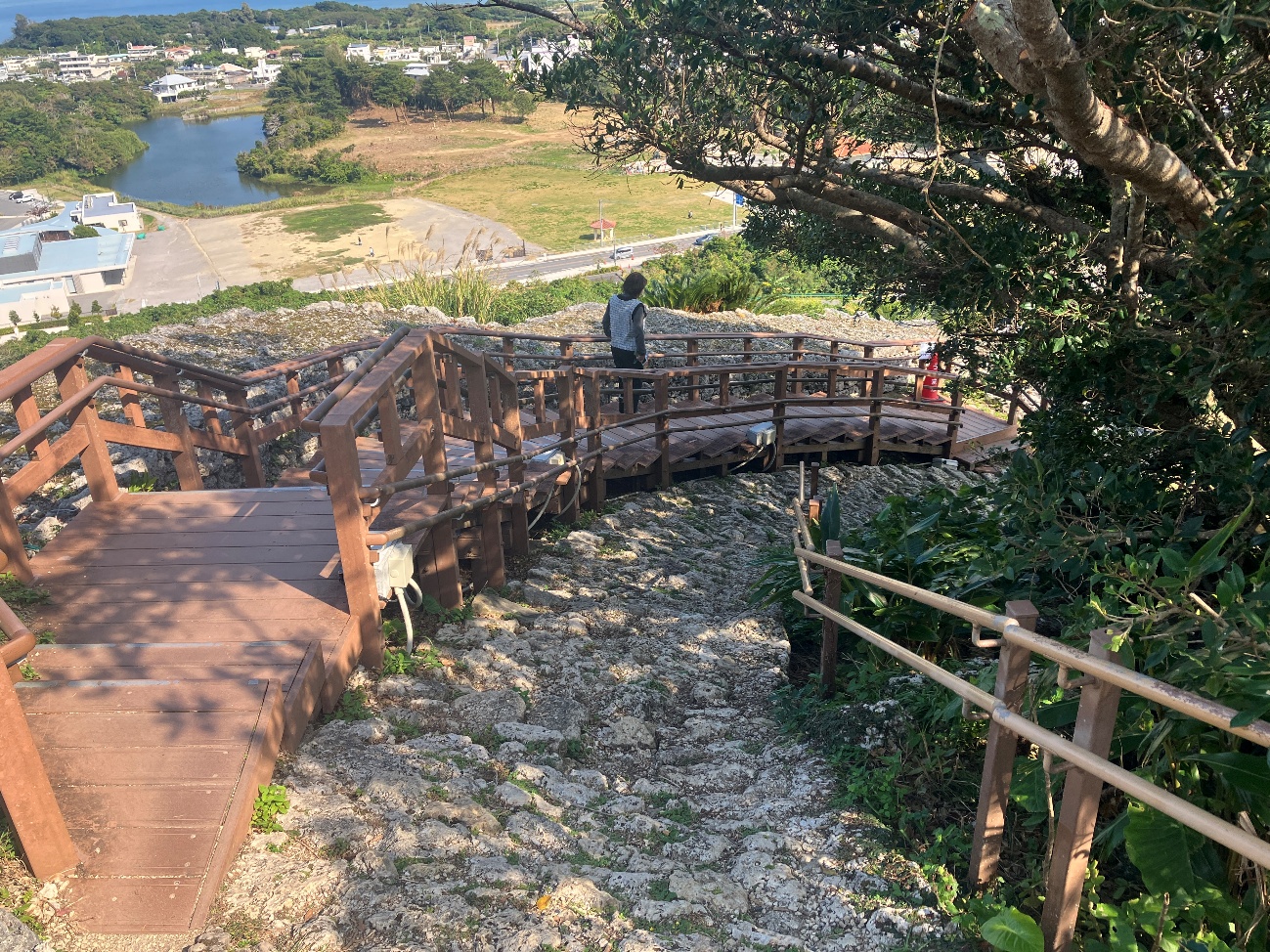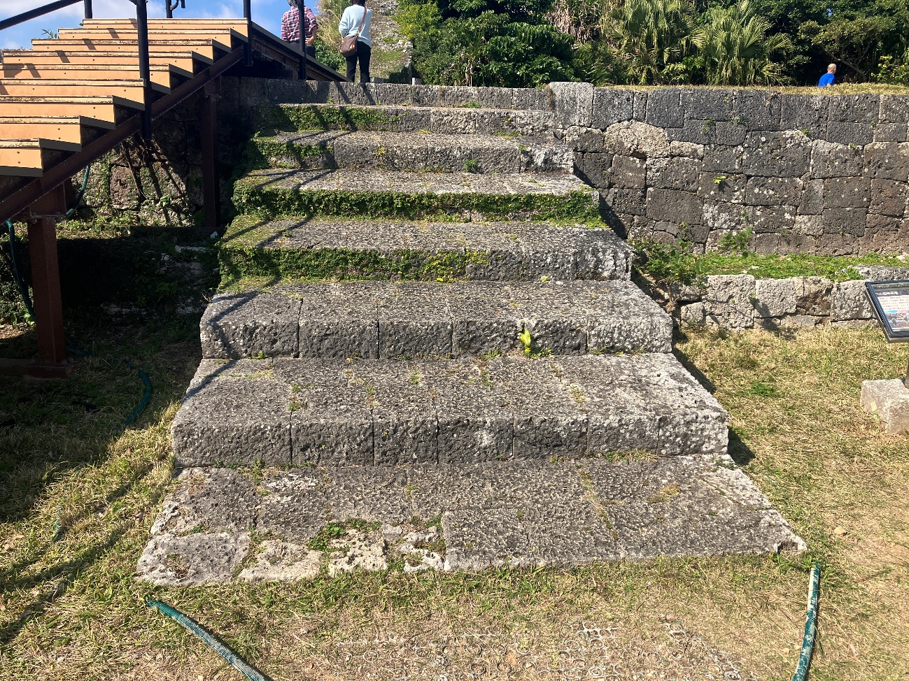 一の曲輪階段は、敵軍による侵入などの勝連城有事の際の、 “最終防御ライン” としての役割を担っており、 城内に攻め入った敵が一挙に侵入できないよう、上るにつれて階段幅が徐々に狭まる構造となっています。