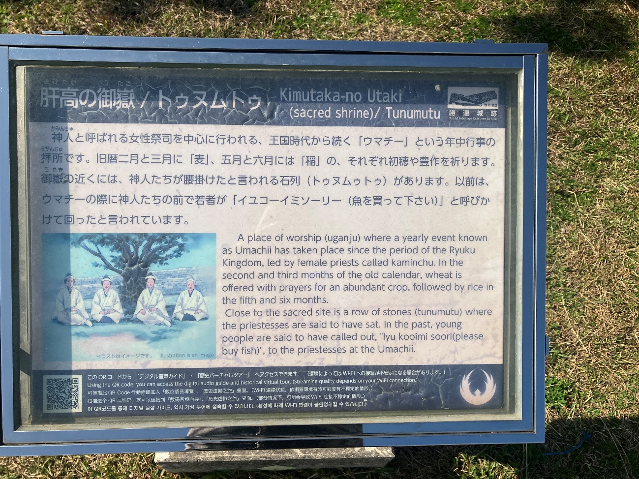 御嶽(うたき)の近くには、 神人たちが腰掛けたと言われる石列 (トゥヌムゥトゥ) があります。以前は、ウマチーの際に神人たちの前で若者が 「イユコーイミソーリー (魚を買って下さい)」と呼びかけて回ったと言われています。