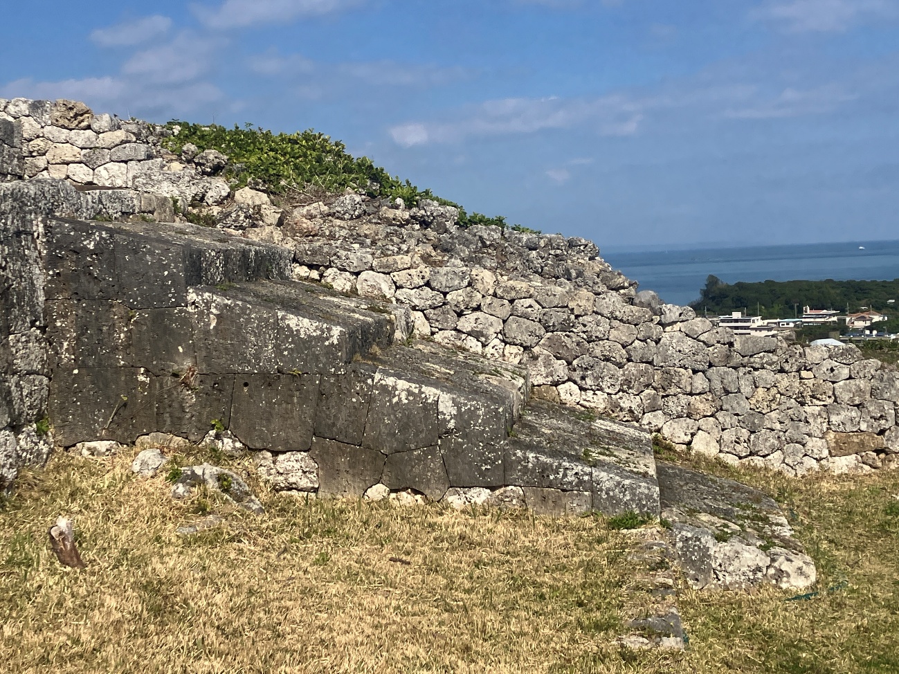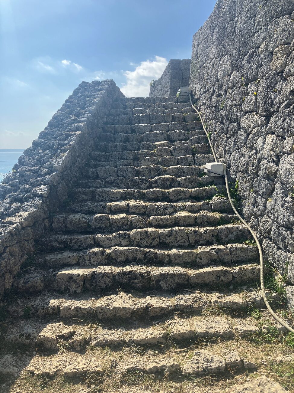 勝連城の各曲輪を結ぶ石階段は、城壁に沿うように右側から旋回して上る構造になっています。