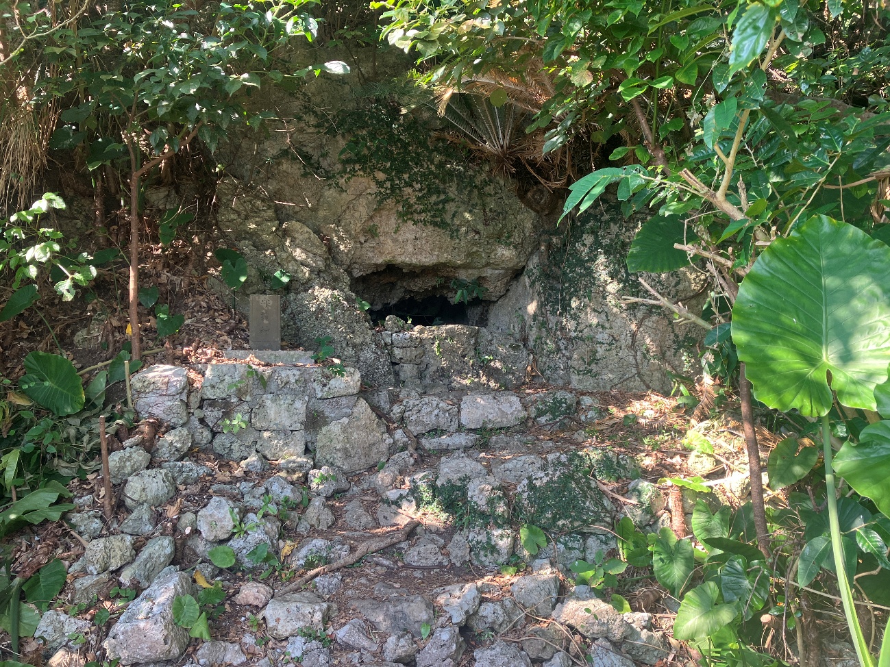 この洞穴は一の曲輪 「玉ノミウヂ御嶽」 脇の洞穴と繋がっており、城主である阿麻和利は、ここを抜けて現在の読谷村まで逃げ延びたという伝説が残っています。