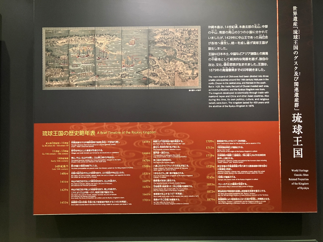 王国は日本本土、中国などアジア諸国との貿易の中継地として経済的な発展を遂げ、独自の政治、文化、信仰思想が生まれました。