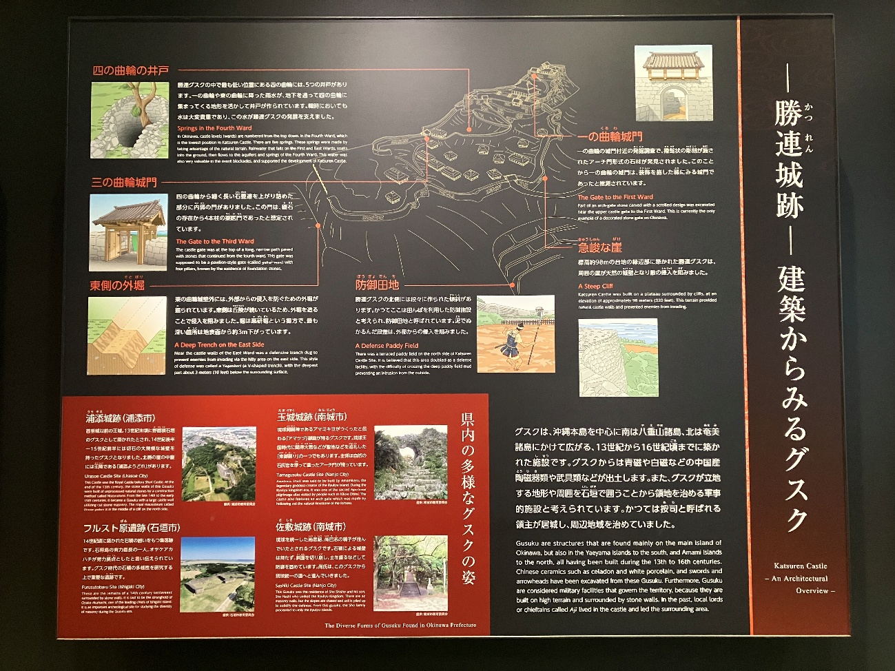 多くのグスクの中で瓦ぶきの建物があったのは、現在のところ勝連城のほかには首里城、 浦添城だけです。