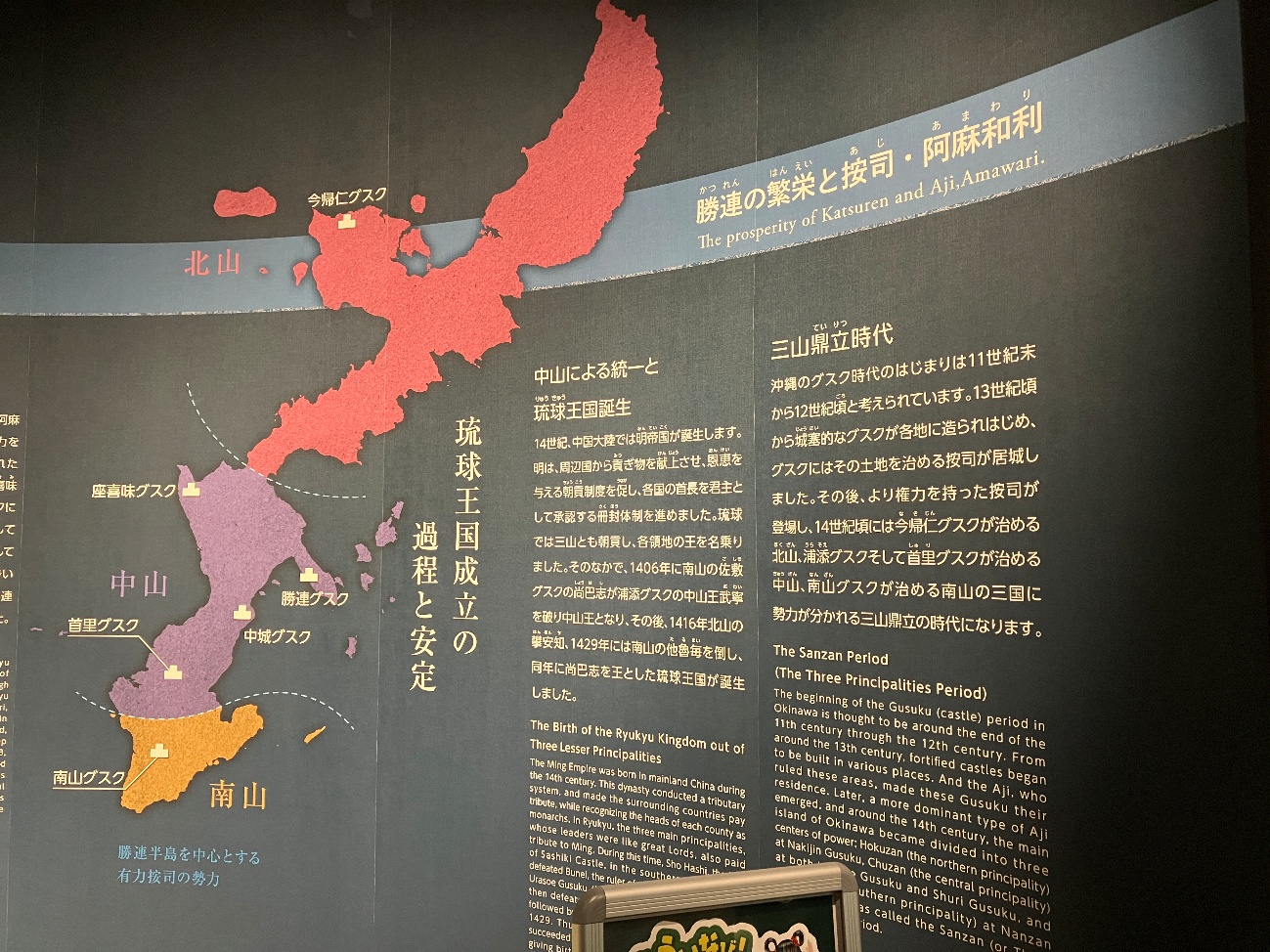 その後、より権力を持った按司が登場し、14世紀頃には今帰仁グスクが治める北山、浦添グスクそして首里グスクが治める中山、南山グスクが治める南山の三国に勢力が分かれる三山鼎立の時代になります