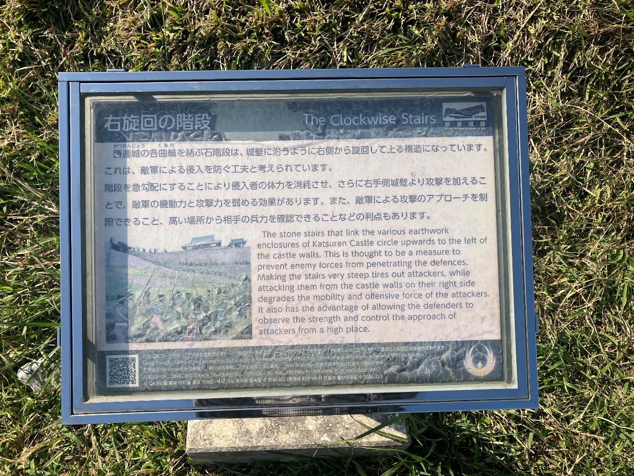 階段を急勾配にすることにより侵入者の体力を消耗させ、さらに右手側城壁より攻撃を加えることで、敵軍の機動力と攻撃力を弱める効果があります。