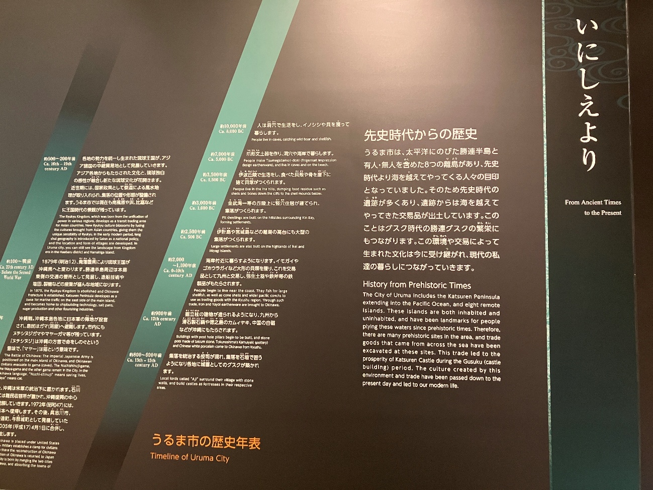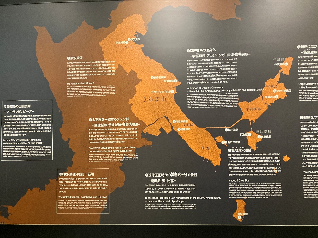 うるま市は、 太平洋にのびた勝連半島と有人・無人を含めた8つの離島があり、先史時代より海を越えてやってくる人々の目印となっていました。