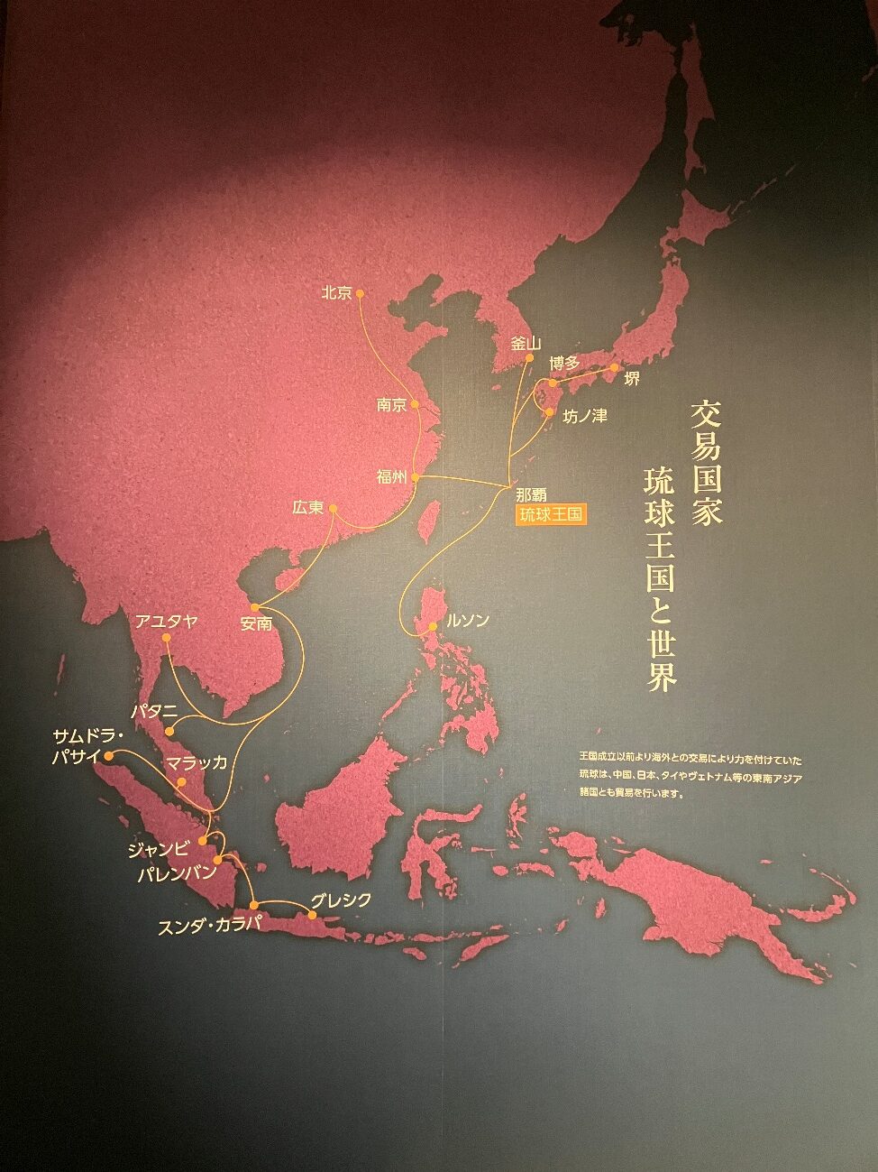 琉球は、日本、中国、朝鮮、そして東南アジアを結ぶ海路のちょうど中心に位置していたため、食料や水の補給拠点や、そして各地の荷物を積み替える中継拠点として大いに栄えました。