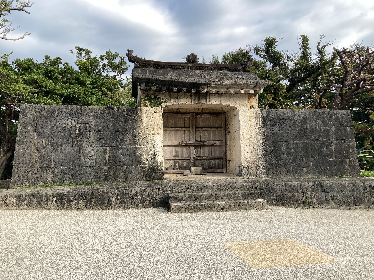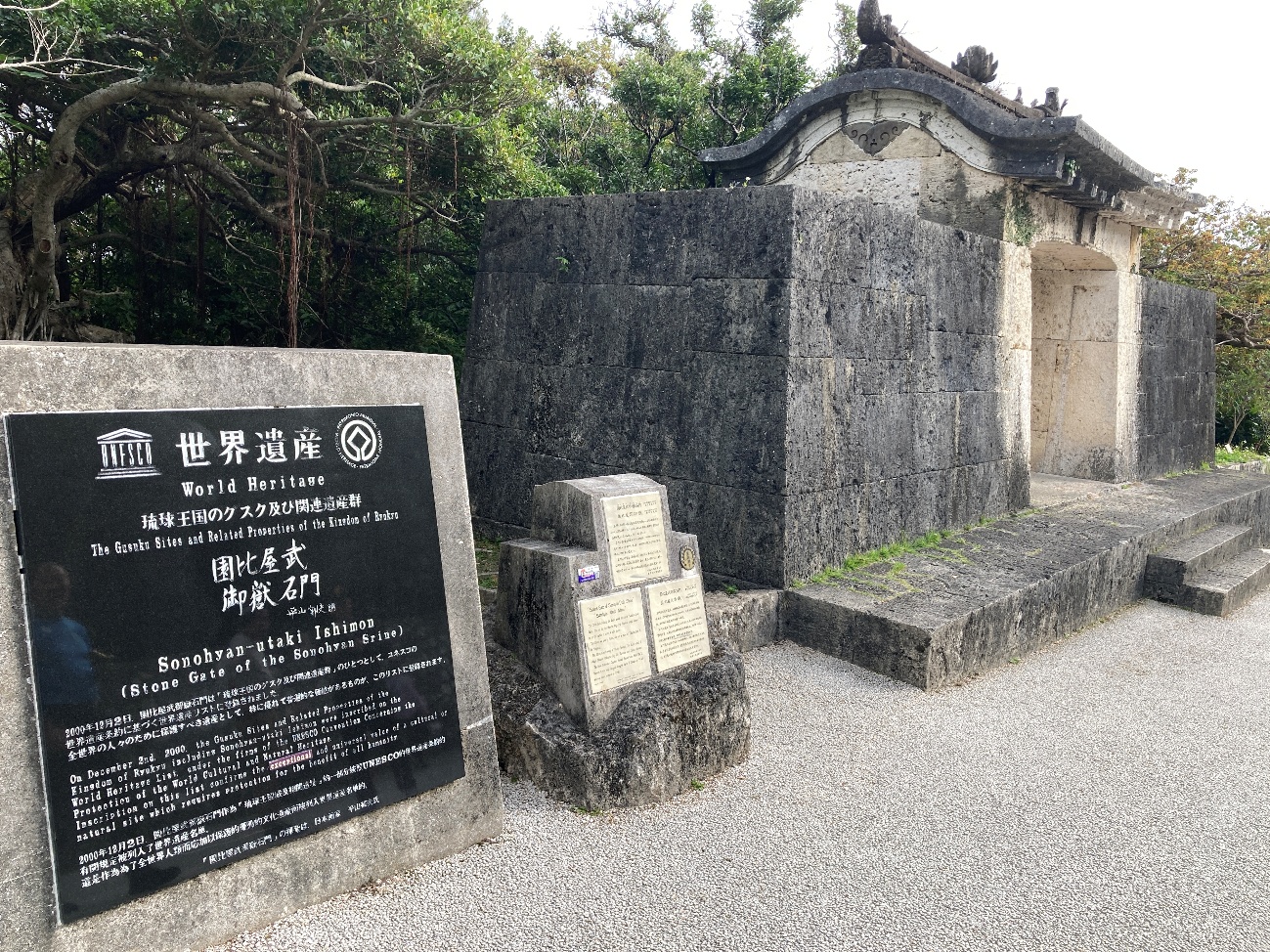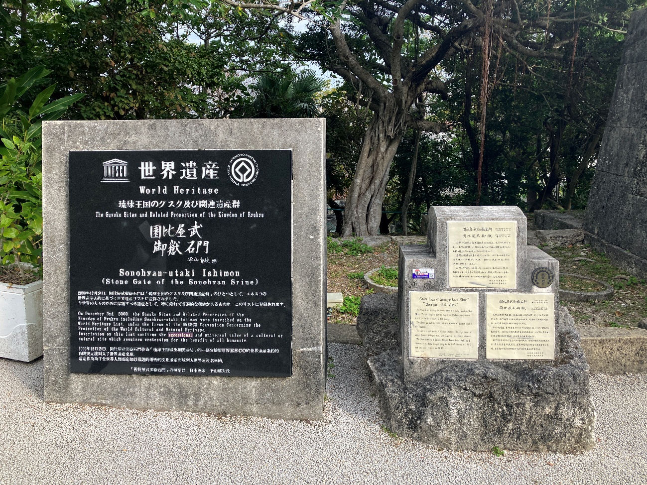 石門とその奥の森を園比屋武御獄(そのひやんうたき)といい王府の祈願所であった石門は神社でいう拝殿にあたるが本殿に相当する建物はなく石門の後ろに広がる森がそれにあたるという