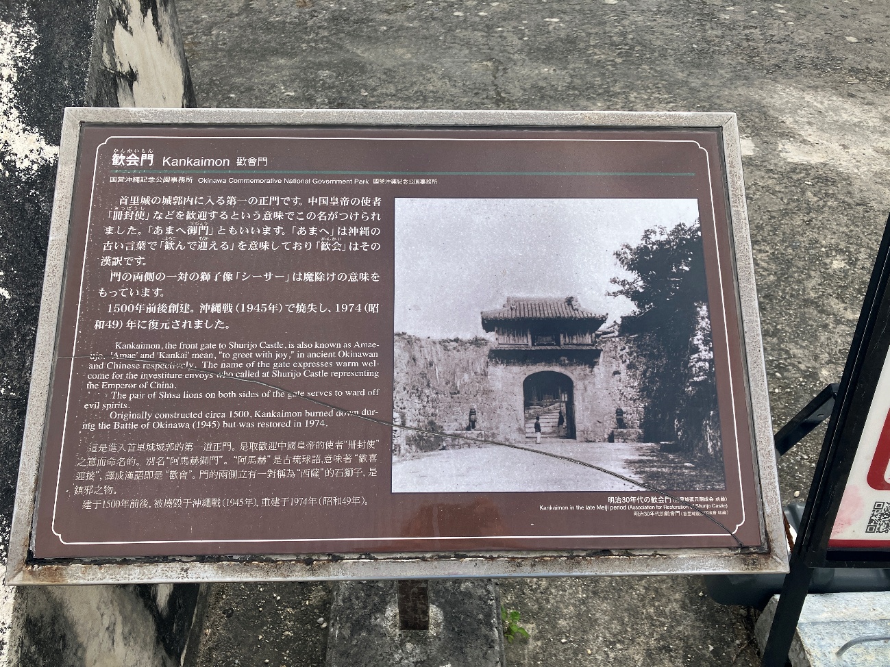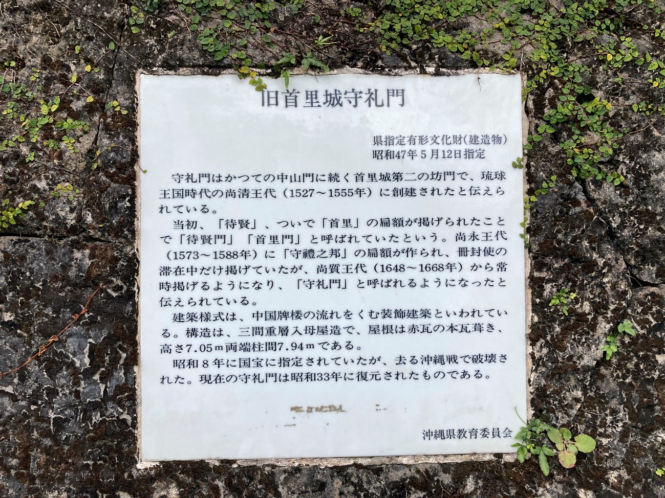 尚永王代(1573~1588年) に 「守禮之邦」の扁額が作られ、 冊封使の滞在中だけ掲げていたが、 尚質王代 (1648~1668年)から常時掲げるようになり、 「守礼門」 と呼ばれるようになったと伝えられている。