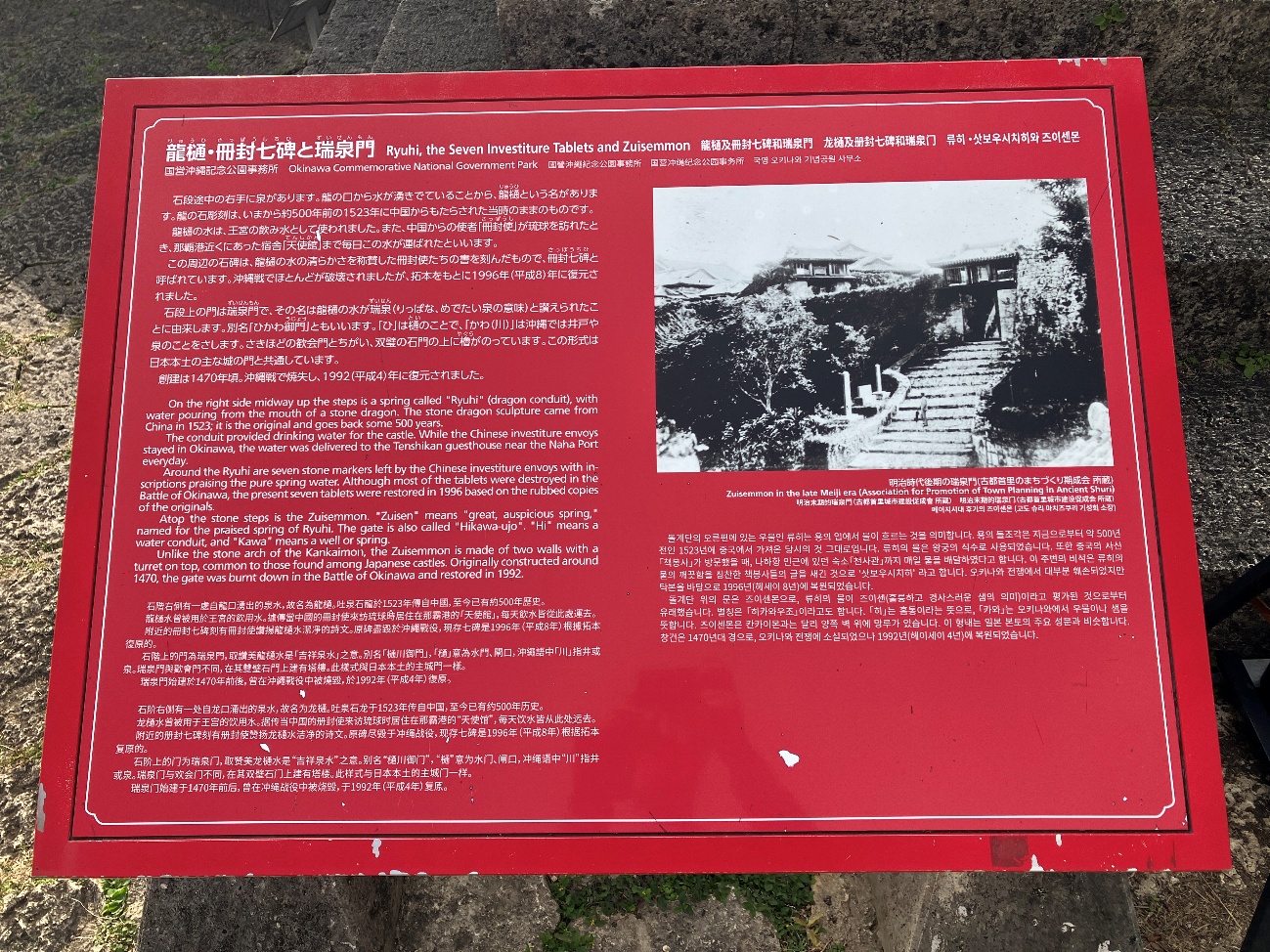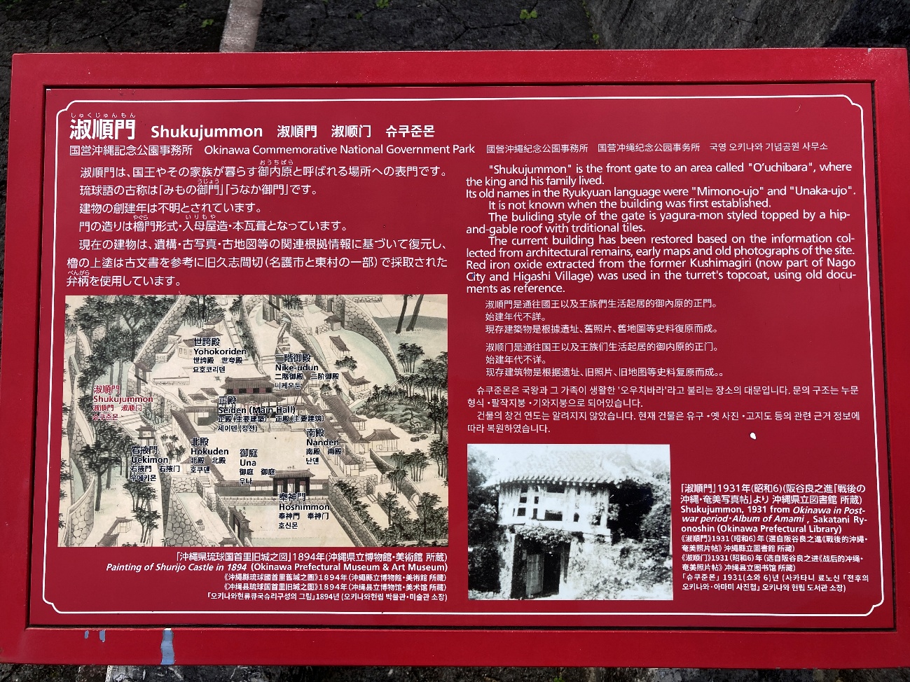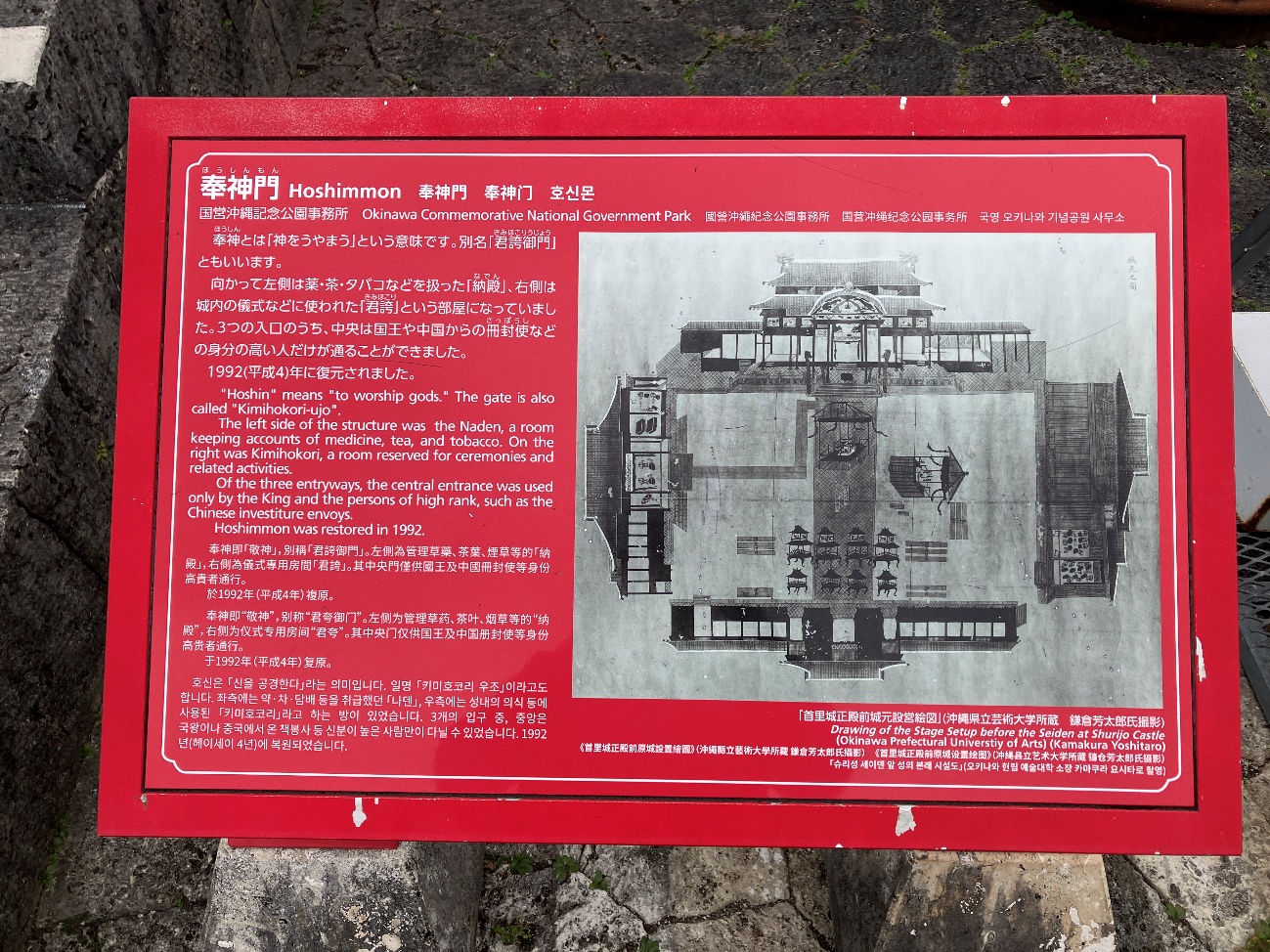 石門の創建は尚真王時代の1519年 1933年には旧国宝に指定されたが沖縄戦で大破 1957年に復元され後に解体修理し1986年に完成した。