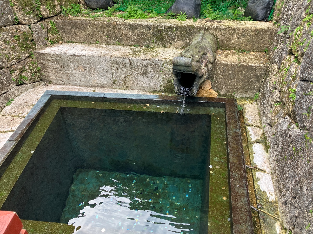 石段途中の右手に泉があります。